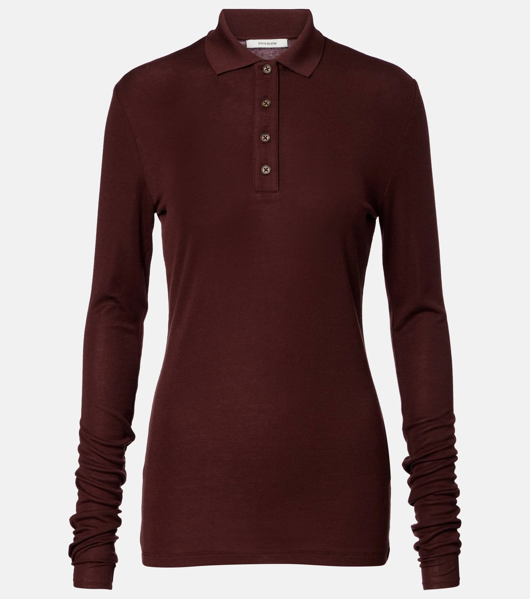 Designed to outlast the archives, Entire Studios constructs each piece with meticulous attention to detail and longevity in mind. Coming in brown, this polo sweater is primed to become a staple in your everyday rotation. Product Details - Material: 79.4% Tencel®, 17.4% wool, 3.2% elastane - Care instructions: dry clean - Made in China - Color: brown - Designer color name: Saddlewood - Collar: polo collar - Closure: partially buttoned front - Item number: P01151536 Size & Fit - True to size - Fitted - Stretchy fabric - Falls below the hip - The model seen in the picture is 178cm-5'10" and wearing a size XS