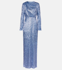 Romantic and sophisticated, Erdem's creations are destined to command attention. This long-sleeve gown features a draped bodice and is fully adorned with shimmering beads and sequins. Product Details - Material: 95% polyester, 5% elastane - Care instructions: spot clean - Made in the UK - Designer color name: Artist's Blue - Item color: blue - Lining: 100% silk - Embroidery: 100% polyethylene - Closure: invisible zipper - Long vent - Item number: P01081541 Size & Fit - True to size - Cinched waist - Non-stretchy fabric - slit length 59cm-23" - The model seen in the picture is 178cm-5'10" and wearing a size UK 8