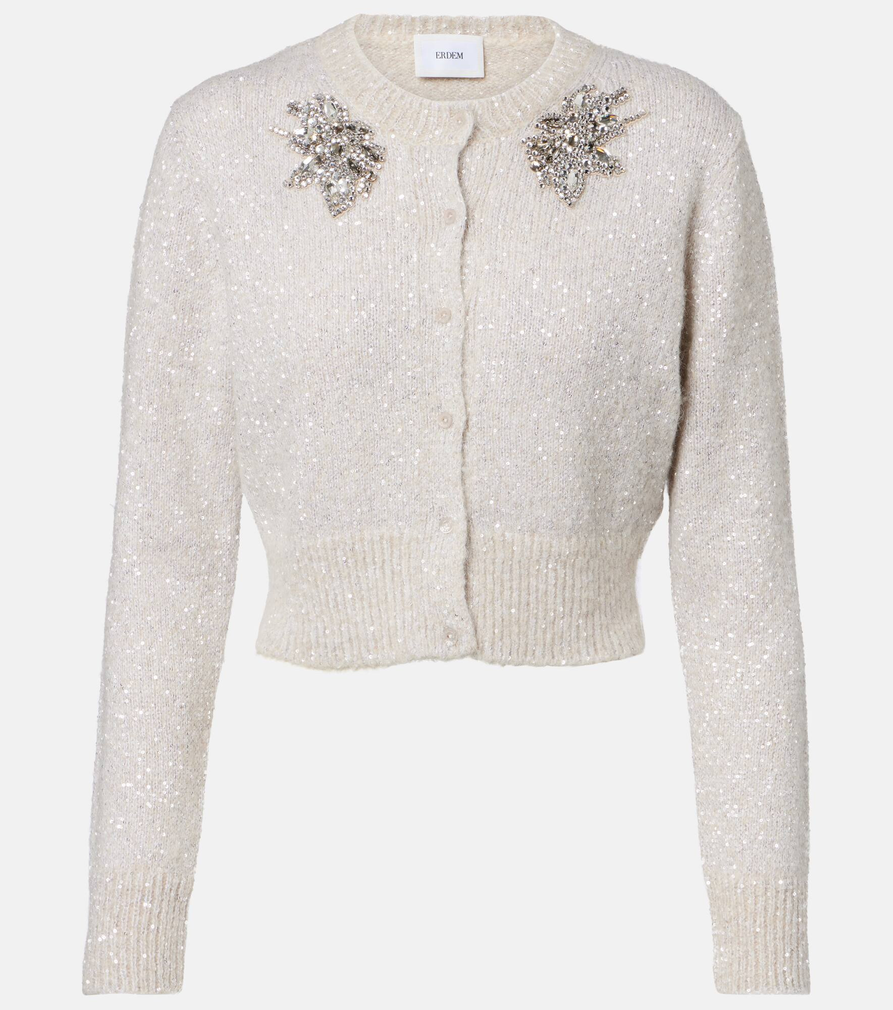 Incorporate modern romance into your edit with Erdem's whimsical and delicate designs. This cardigan is made from a soft alpaca-blend, decorated with dazzling sequins and embellished floral details at the front. Product Details - Material: 70% alpaca wool, 30% polyamide - Care instructions: dry clean - Made in Romania - Designer color name: Champagne - Item color: beige - Material II: 55% polyamide, 45% polyester - Embroidery: 60% glass, 30% brass, 10% acrylic - Closure: buttoned front - Cuff: ribbed - Hem: ribbed - Item number: P01082343 Size & Fit - True to size - Cinched waist - Slightly stretchy fabric - Cropped - The model seen in the picture is 178cm-5'10" and wearing a size XS