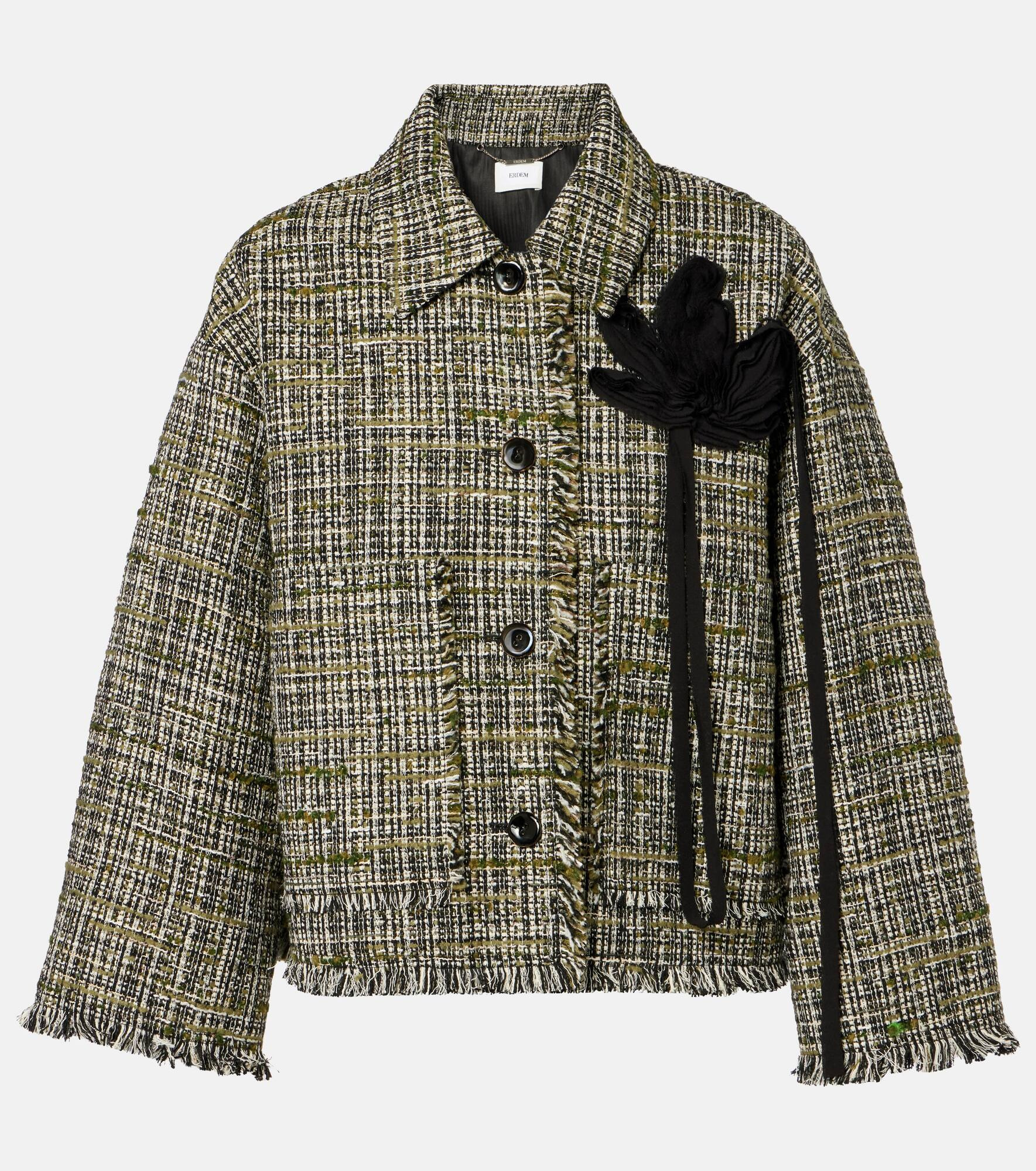 Incorporate an air of modern romance into your edit with Erdem's whimsical and delicate designs. This jacket is crafted from tweed, has a slightly cropped and boxy fit, and is topped with a floral applique. Product Details - Material: 30% polyacrylic, 20% cotton, 17% cotton (recycled), 11% wool, 11% polyester, 7% polyamide, 3% polyester (recycled), 1% other fibres - Care instructions: dry clean - Made in Romania - Designer color name: Dark Olive - Item color: multicolor - Lining: 100% cotton - Lining II: 100% cupro - Embroidery: 100% viscose - Closure: buttoned front - Collar: classic (Straight point) - Fully lined - Item number: P01058077 Size & Fit - True to size - Dropped shoulders - Designed for a loose fit - Non-stretchy fabric - Slightly cropped - The model seen in the picture is 178cm-5'10" and wearing a size UK 8