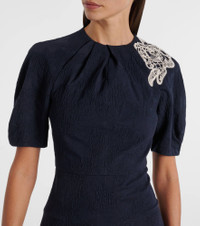 Incorporate an air of modern romance into your edit with Erdem's whimsical and delicate designs. This midi dress is crafted from a cotton-blend jacquard and complete with a floral-embroidered shoulder detail. Product Details - Material: 87% cotton, 13% polyester - Care instructions: dry clean - Made in Portugal - Designer color name: Midnight Blue - Item color: blue - Lining: 100% cotton - Embroidery: 100% viscose - Closure: invisible zipper - Item number: P01058043 Size & Fit - Fits large to size - we recommend trying one size smaller - Cinched waist - Non-stretchy fabric - The model seen in the picture is 178cm-5'10" and wearing a size UK 6