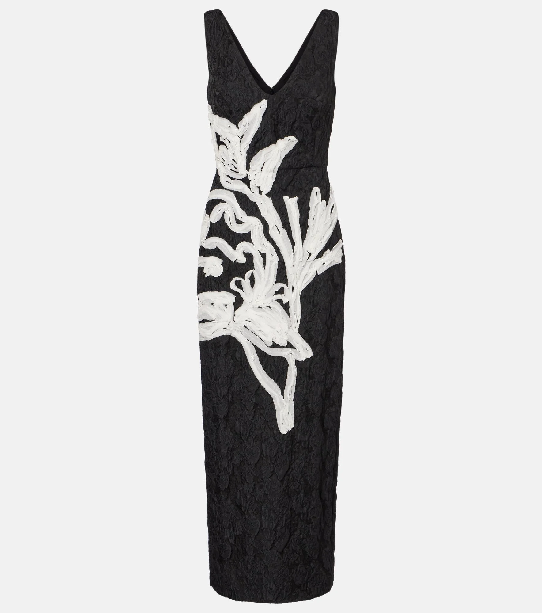 Incorporate modern romance into your edit with Erdem's whimsical and delicate designs. This midi dress is crafted from a jacquard fabric and is complete with contrasting floral embroidery. Product Details - Material: 83% polyester, 17% polyamide - Care instructions: dry clean - Made in the UK - Designer color name: Black - Item color: black, white - Lining: 100% silk - Embroidery: 90% viscose, 10% nylon - Collar: V-neck - Closure: concealed zipped back - Short vent - Item number: P01081533 Size & Fit - True to size - Low back - Cinched waist - Non-stretchy fabric - slit length 41cm-16" - The model seen in the picture is 178cm-5'10" and wearing a size UK 8