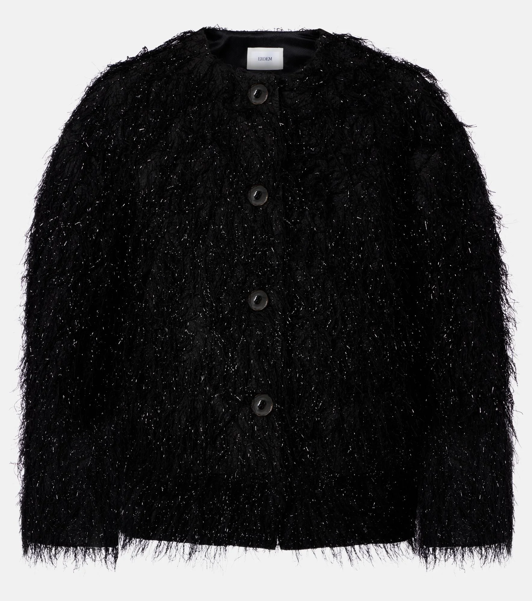 Incorporate modern romance into your edit with Erdem's whimsical and delicate designs. This classic jacket is crafted from Lurex® fil coupe fabric, which combines a matte finish with sparkling tinsel-like threads. Product Details - Material: 95% polyester, 4% viscose, 1% elastane - Care instructions: dry clean - Made in the UK - Designer color name: Black - Item color: black - Material II: 100% cotton - Lining: 100% cupro - Closure: buttoned front - Pockets: flap pockets - Item number: P01082339 Size & Fit - True to size - Straight fit - Non-stretchy fabric - Falls to the hip - The model seen in the picture is 178cm-5'10" and wearing a size UK 8