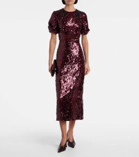 Incorporate modern romance into your edit with Erdem's whimsical and delicate designs. This short-sleeved midi dress is adorned with all-over sequins and beaded detailing at the neckline for a glamorous finish. Product Details - Material: 100% polyester - Care instructions: dry clean - Made in Bulgaria - Designer color name: Mulberry Red - Item color: burgundy - Lining: 75% acetate, 25% silk - Closure: concealed zipped back - Long vent - Item number: P01082334 Size & Fit - True to size - Fitted - Non-stretchy fabric - The model seen in the picture is 178cm-5'10" and wearing a size UK 8