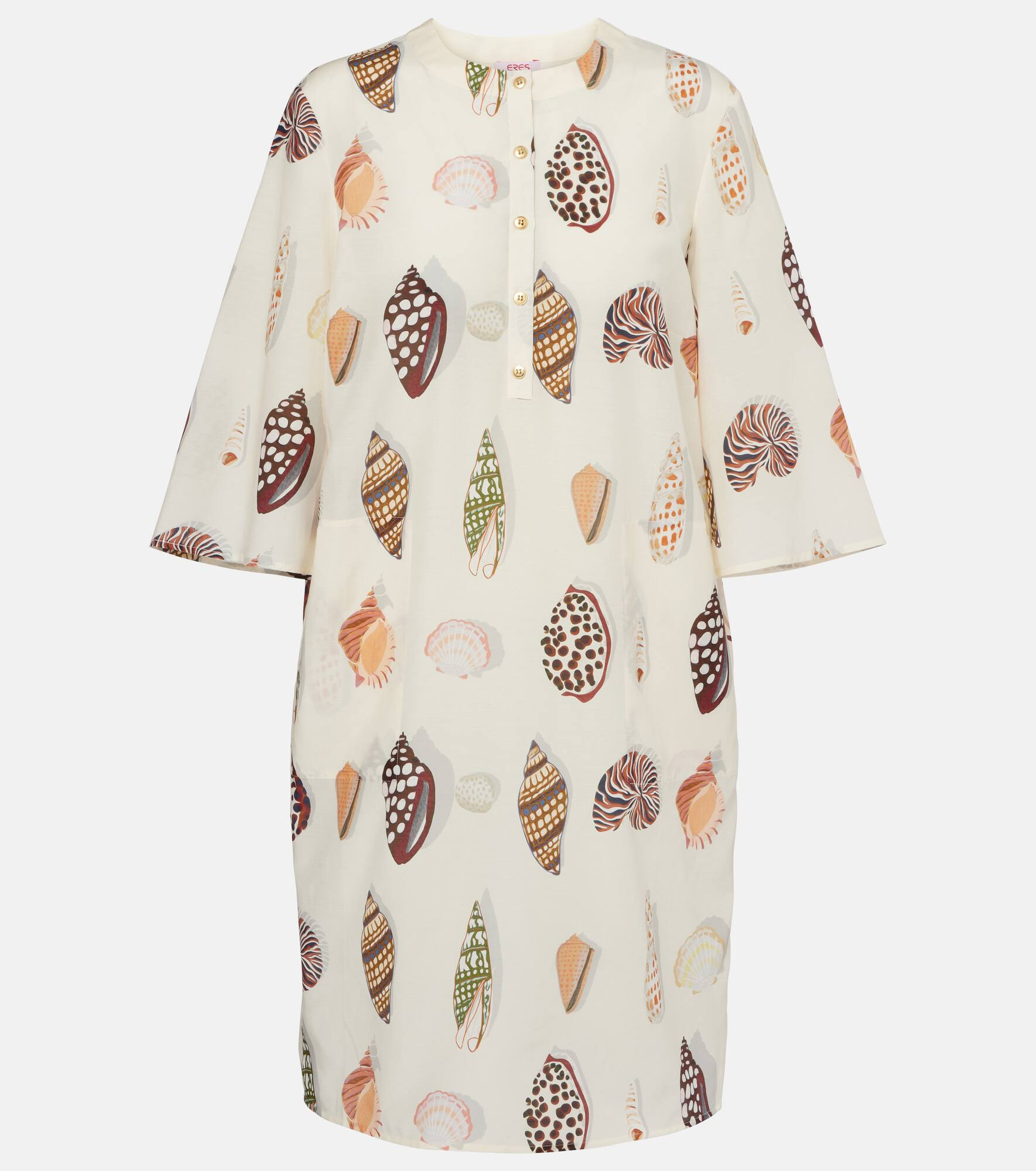The Creme minidress from Eres is crafted from cotton and silk and features an allover print. This design is cut to a relaxed silhouette and showcases a round neckline with a buttoned front. Product Details - Material: 68% cotton, 32% silk - Care instructions: dry clean - Made in China - Designer color name: Imprime Grain De Cafe - Item color: white - Item number: P01063509 Size & Fit - True to size - Designed for a loose fit - Non-stretchy fabric - The model seen in the picture is 178cm-5'10" and wearing a size S