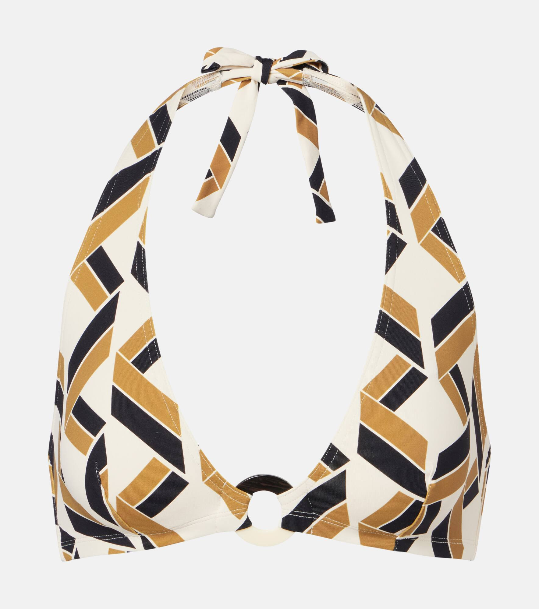 Boasting an iconic 70s-inspired psychedelic print, the Dimension triangle bikini top from Eres delivers retro sophistication. Tie halterneck straps ensure flawless, structured support to this swimwear design crafted from Peau Douce fabric. Product Details - Material: 77% polyamide, 23% elastane - Care instructions: machine wash at 30 degrees - Made in France - Designer color name: Imperime Swim Noir - Item color: beige, black - Boning - Closure: toggle fastening - Item number: P01096142 Size & Fit - True to size - Unpadded Top - The model seen in the picture is 178cm-5'10", cup size B, and wearing a size FR 38