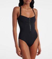 The Egeria swimsuit from Eres features a sculpted, chic silhouette with a jacquard design at the bust. The piece is complete with grosgrain racerback straps and zip-up detailing for a sporty, retro look. Product Details - Material: 91% polyamide, 9% elastane - Care instructions: machine wash cold - Made in Morocco - Designer color name: Noir - Item color: black - Closure: half-zipped front - Item number: P01042112 Size & Fit - Fits small to size - we recommend trying one size larger - Unpadded Top - Medium-cut leg - The model seen in the picture is 178cm-5'10" and wearing a size FR 36