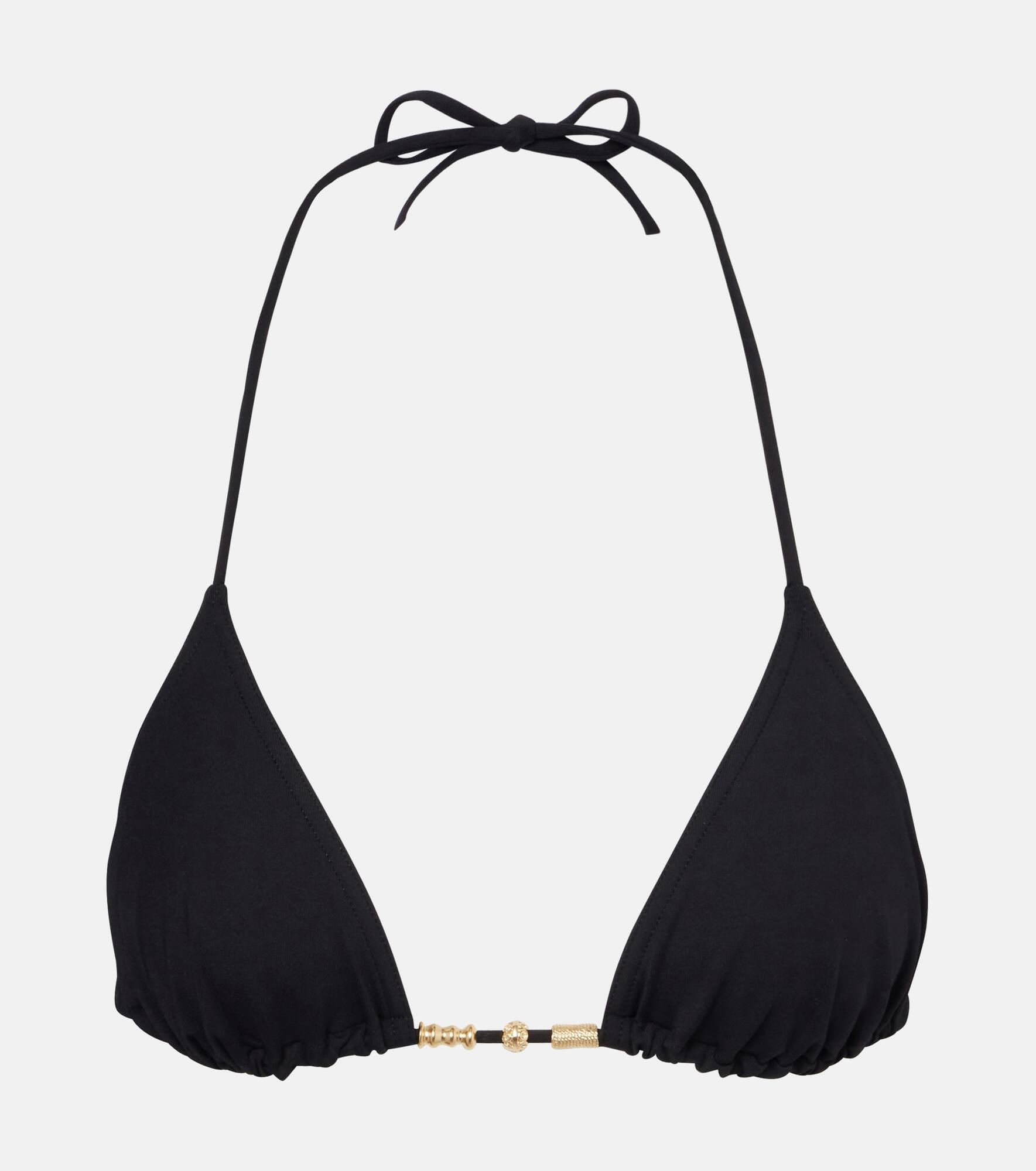 The Ephemere bikini top from Eres features a classic triangle silhouette with self-tie straps for a customized fit. Made in Italy, the design is complete with gold-plated bead embellishments at the center for a touch of glamor. Product Details - Material: 77% polyamide, 23% elastane - Care instructions: hand wash - Made in France - Designer color name: Noir - Item color: black - Item number: P01063511 Size & Fit - Fits small to size - we recommend trying one size larger - Please note: small cups - Unpadded Top - The model seen in the picture is 178cm-5'10", cup size B, and wearing a size FR 38
