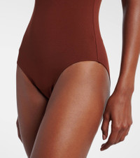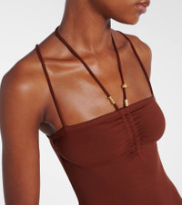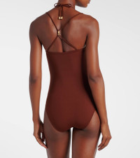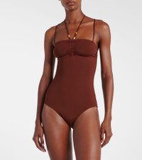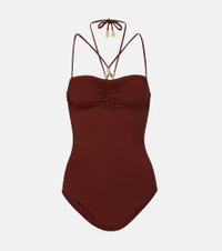 The Odyssee swimsuit from Eres features gathered detailing at the bust. This design comes with halterneck straps that are embellished with gold-plated beads. Product Details - Material: 77% polyamide, 23% elastane - Care instructions: machine wash at 30 degrees - Made in France - Designer color name: Tortue - Item color: brown - Hardware color: gold - Self-tie neck - Item number: P01063569 Size & Fit - Fits small to size - we recommend trying one size larger - Unpadded Top - Medium-cut leg - The model seen in the picture is 178cm-5'10" and wearing a size FR 38