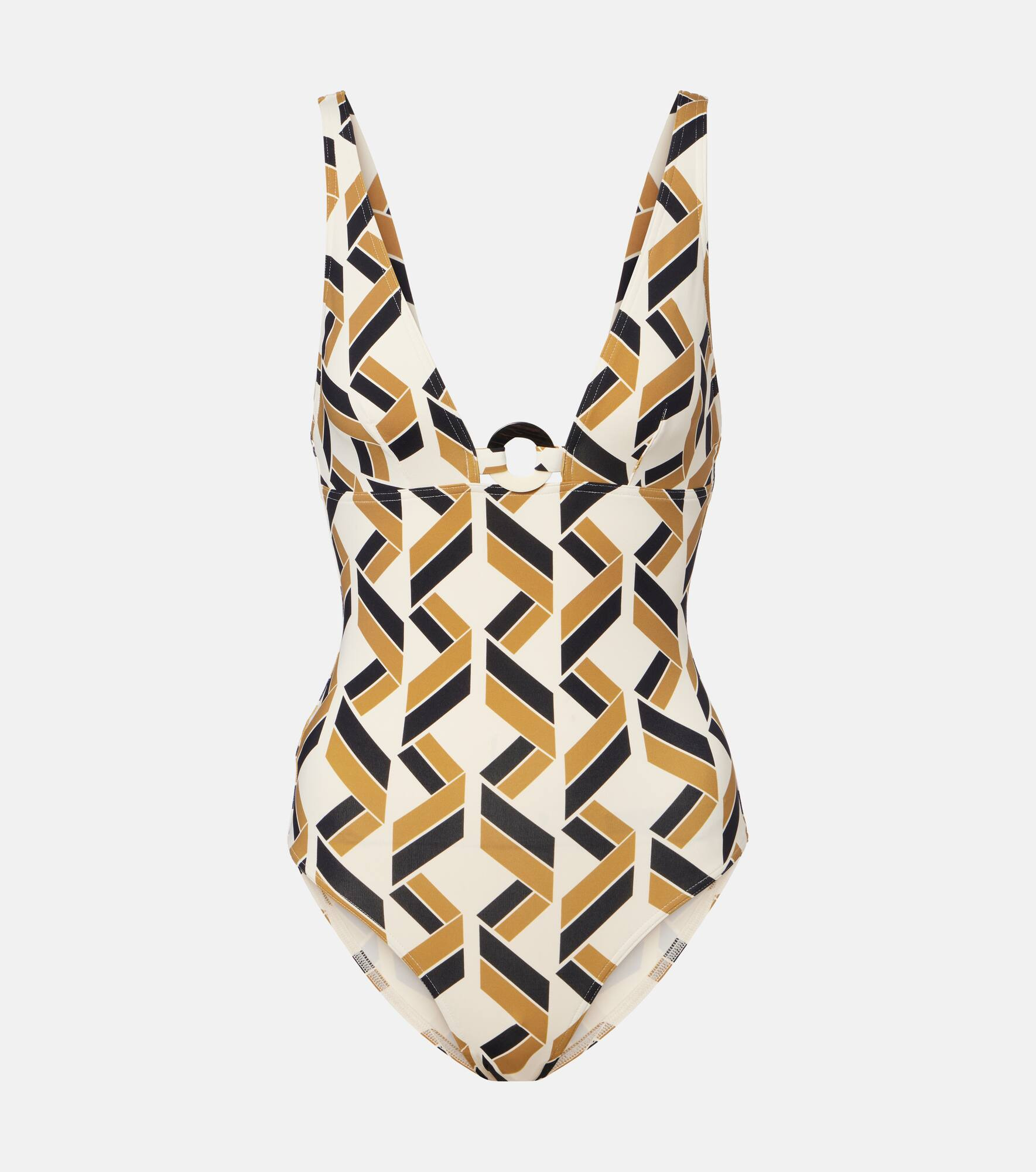 The Party swimsuit from Eres features a vibrant pattern, a center ring detail, and wide straps. This piece is made from the brand’s signature Peau Douce, a second-skin fabric that stretches for the perfect fit. Product Details - Material: 77% polyamide, 23% elastane - Care instructions: machine wash at 30 degrees - Made in France - Designer color name: Imperime Swim Noir - Item color: beige, black - Item number: P01096141 Size & Fit - True to size - Unpadded Top - Medium-cut leg - The model seen in the picture is 178cm-5'10", cup size B, and wearing a size FR 38