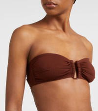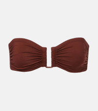 Having revolutionized swimwear in the 1970s, Eres has a legacy of elegant and streamlined silhouettes that flatter every figure. The Show bikini top is a classic bandeau style that gathers at the center and features boning on the sides. Product Details - Material: 84% polyamide, 16% elastane - Care instructions: machine wash at 30 degrees - Made in Italy - Designer color name: Tortue - Item color: brown - Closure: clip fastening - Item number: P01042091 Size & Fit - True to size - Strapless - Unpadded Top - The model seen in the picture is 178cm-5'10", cup size B, and wearing a size FR 38