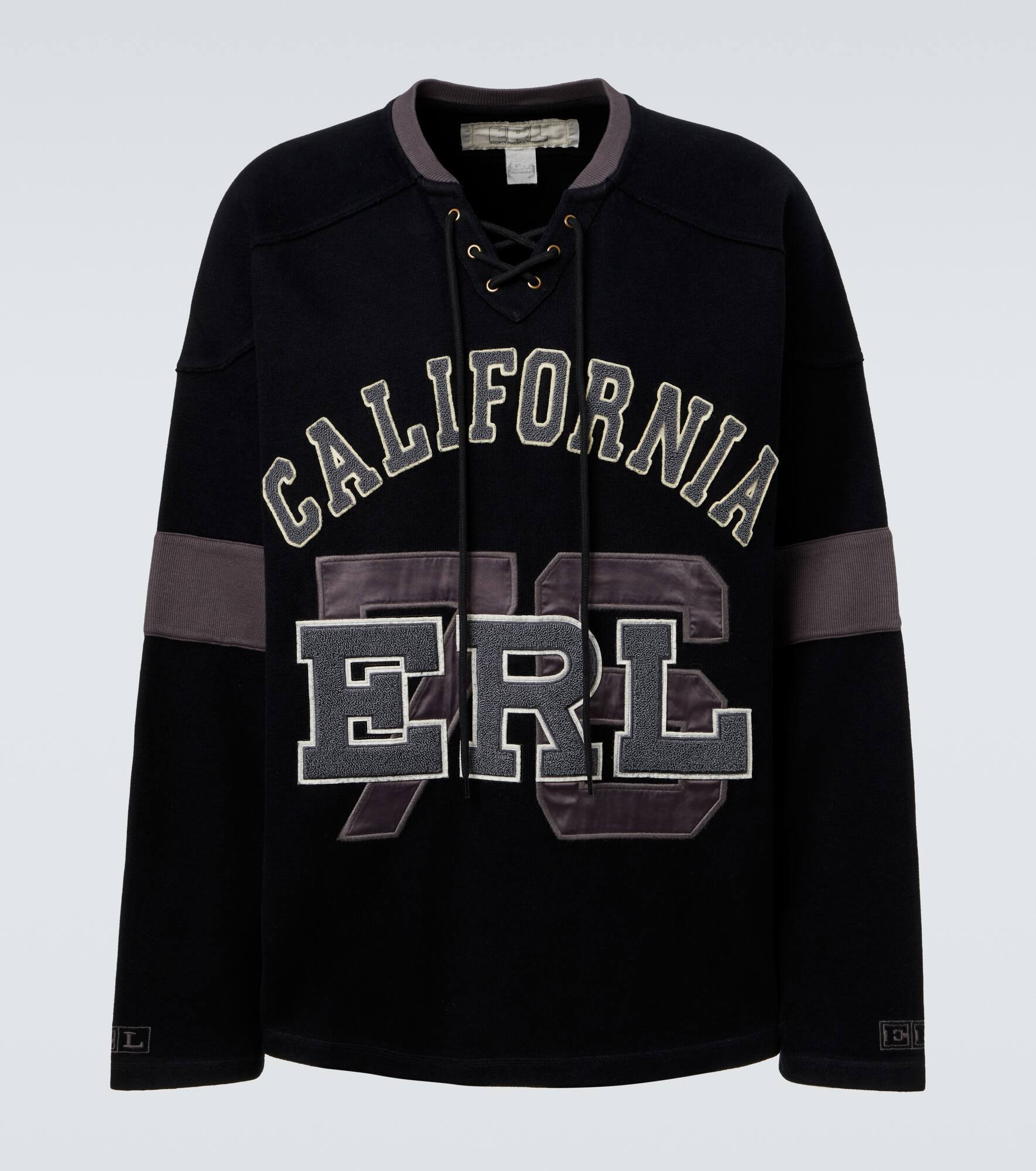 Inspired by California's laid-back lifestyle, ERL's casual designs come in a variety of mood-boosting colors and nostalgic patterns. Made from cotton jersey, this long-sleeved T-shirt boasts a logo embroidery and a lace-up front. Product Details - Material: 100% cotton - Care instructions: machine wash at 30 degrees - Made in Turkey - Designer color name: Black - Item color: black - Closure: self-ties - Item number: P01085195 Size & Fit - Fits large to size - we recommend trying one size smaller - Dropped shoulders - Oversized - Non-stretchy fabric - Falls below the hip - Height of model is 189cm-74.5" and wears a size M
