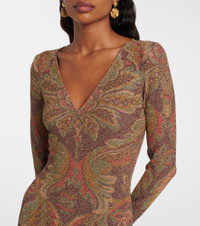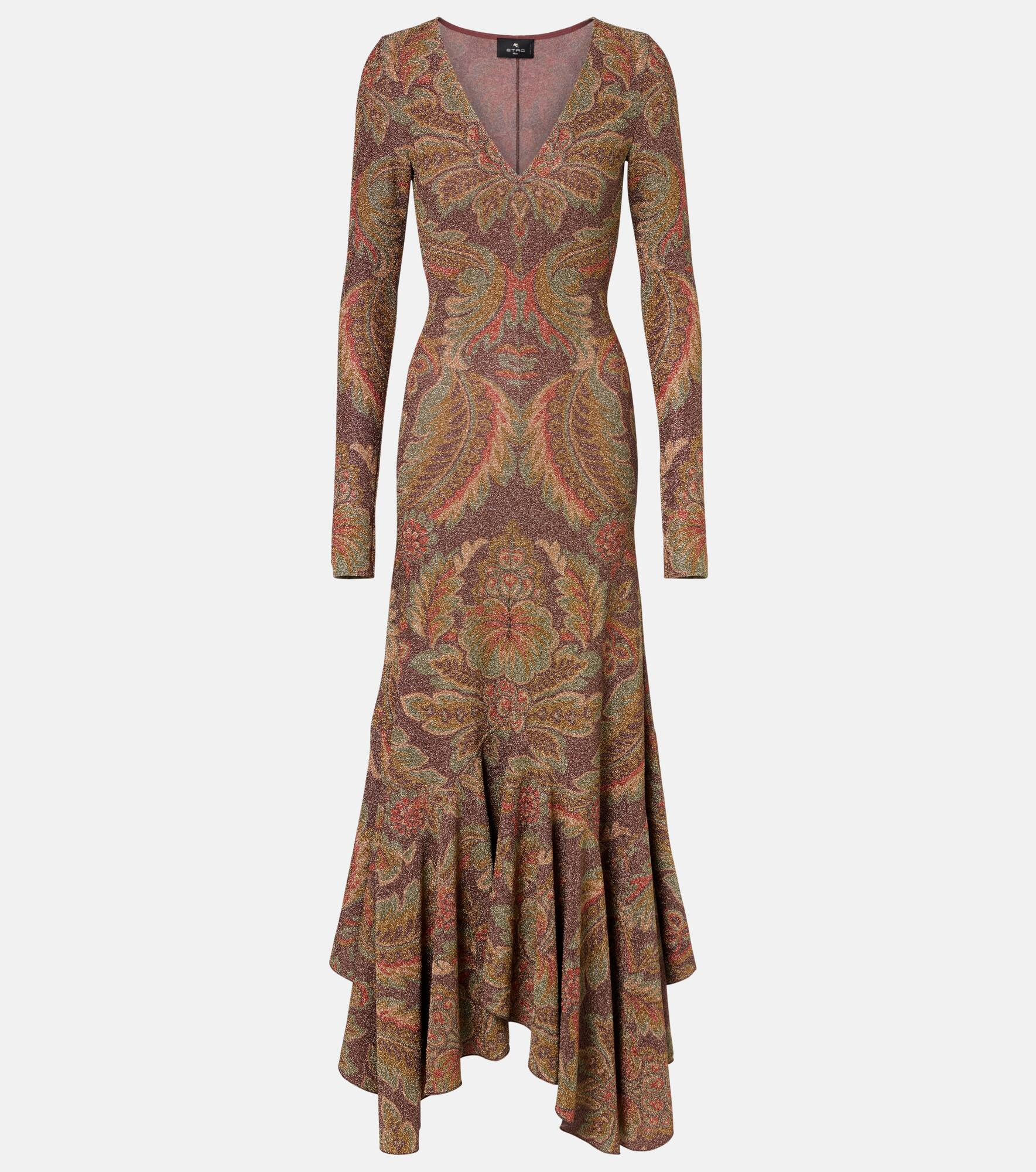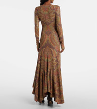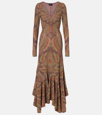Gerolamo and Roberta Etro's love for antique prints and patterns remains a cornerstone of Etro today. Made from terry jersey with lame threads, this gown is enriched with a sophisticated floral motif, a plunging V-neckline, and an asymmetric hem. Product Details - Material: 65% polyamide, 30% polyester, 5% elastane - Care instructions: dry clean - Made in Italy - Designer color name: Print On A Black Base - Item color: multicolor - Collar: V-neck - Item number: P01072955 Size & Fit - True to size - Fitted - Stretchy fabric - The model seen in the picture is 178cm-5'10" and wearing a size IT 40