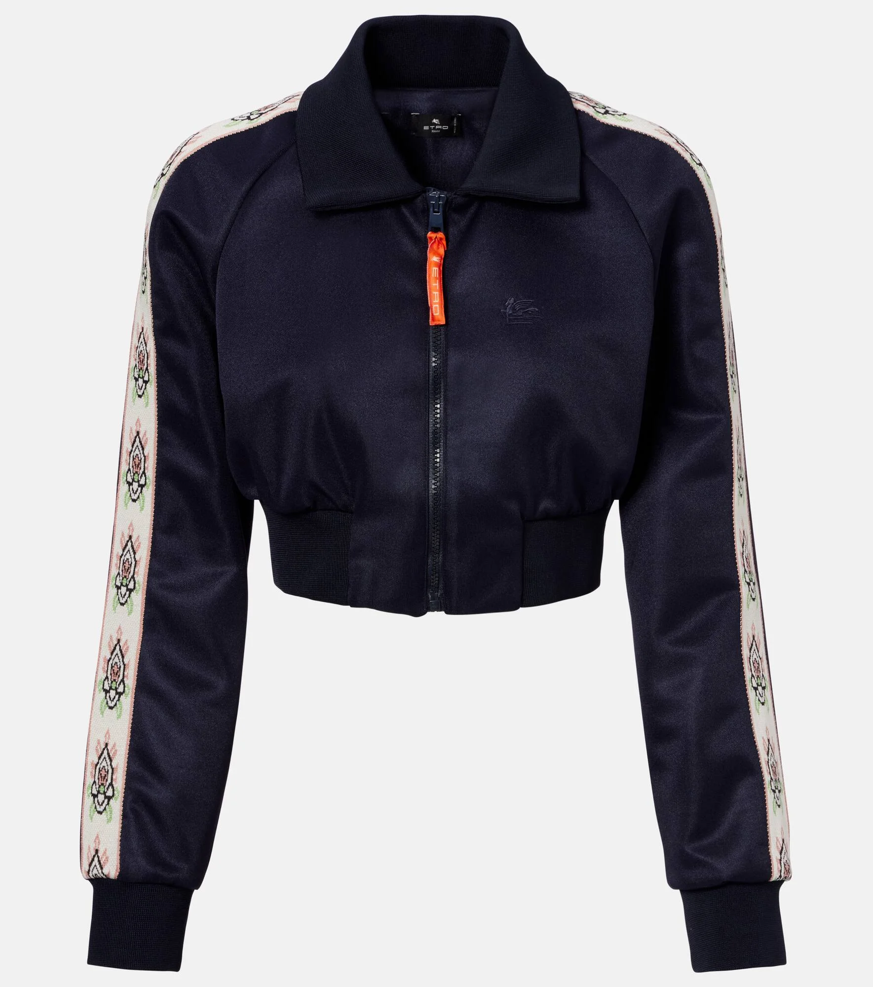 Add this track jacket from Etro to your everyday rotation. Featuring a charming pattern down the sleeves, this style comes in a cropped silhouette complete with tonal Pegaso embroidery at the front. Product Details - Material: 100% polyester - Care instructions: machine wash at 30 degrees - Made in Italy - Color: blue - Designer color name: Blu Scurissimo 3 - Trim: 100% polyester - Closure: zipped front - Cuff: ribbed - Hem: ribbed - Item number: P01152352 Size & Fit - True to size - Cinched waist - Elasticated hem - Non-stretchy fabric - Cropped - The model seen in the picture is 178cm-5'10" and wearing a size XS