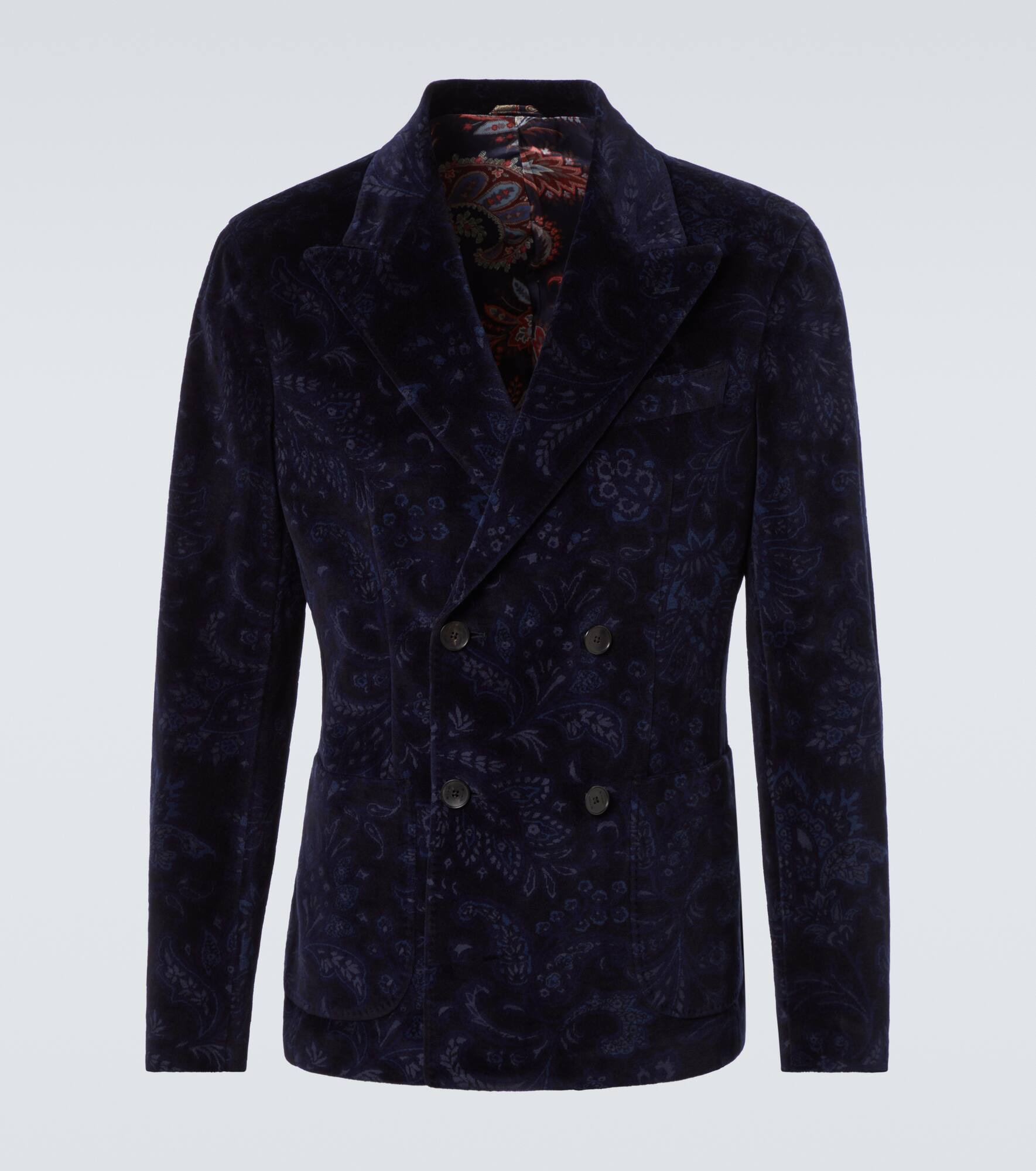 Etro's brand DNA manifests Italian glamour through an approach to elegance that's entirely its own. This double-breasted blazer is crafted from a cotton-blend velvet, showcasing the house’s signature floral jacquard motifs, along with patch pockets and notch lapels. Product Details - Material: 88% cotton, 12% viscose - Care instructions: dry clean - Made in Italy - Designer color name: Dark Blue - Item color: blue - Material II: 100% viscose - Sleeve lining: 57% viscose, 43% polyester - Contains non-textile parts of animal origin - Pockets: breast pocket, patch pockets, internal pockets - Cuff: four buttons - Closure: double-breasted (four buttons) - Vent: double - Includes: dust bag - Item number: P01049723 Size & Fit - True to size - Regular fit - Non-stretchy fabric - Falls below the hip - slit length 21cm-8.5" - Height of model is 189cm-74.5" and wears a size IT 50