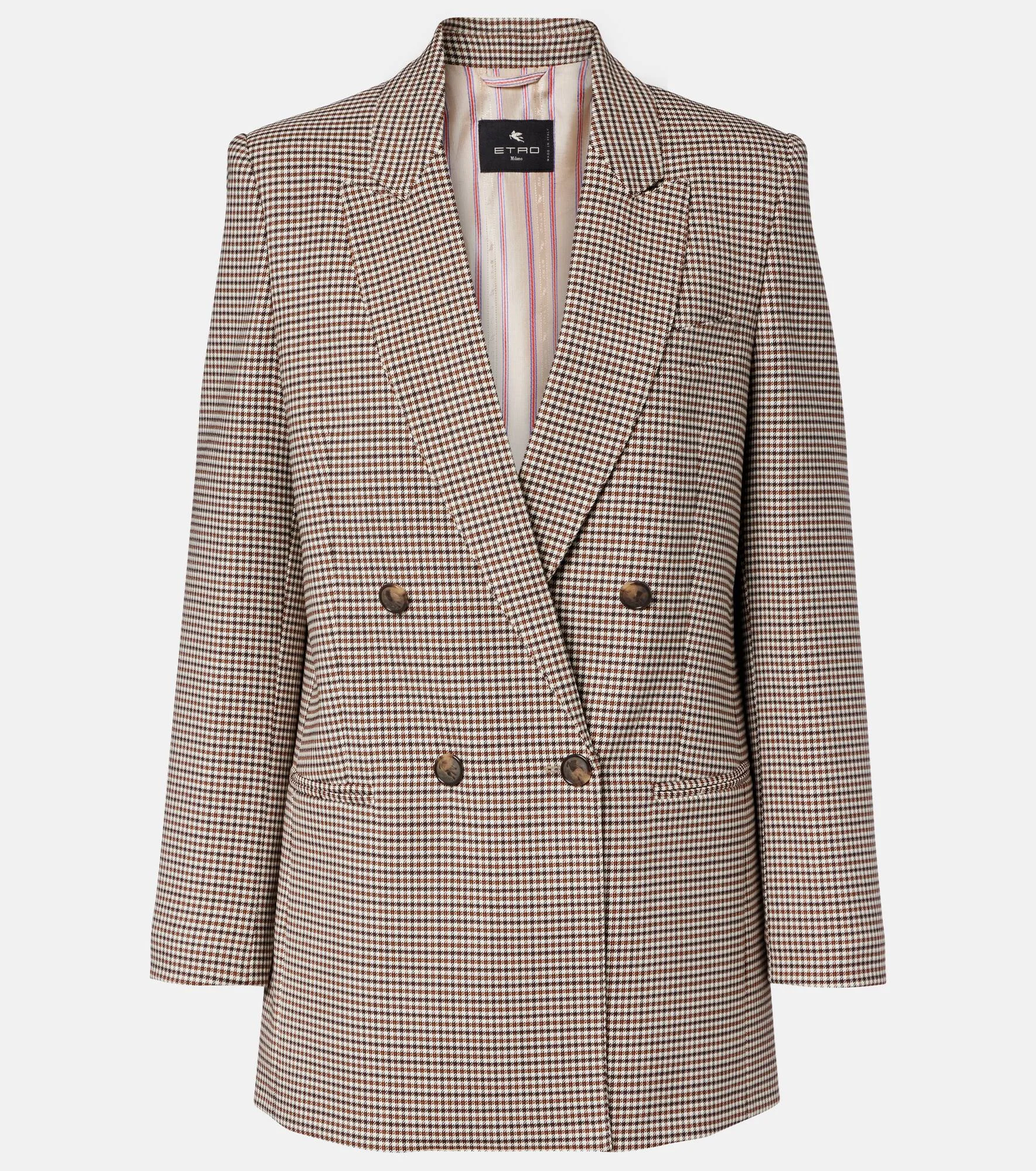 Etro's brand DNA manifests Italian glamour through revelry in color, fabric, and an approach to elegance that's entirely its own. This double-breasted blazer is made from a wool-blend with welt pockets. Product Details - Material: 95% wool, 4% polyamide, 1% elastane - Care instructions: dry clean - Made in Italy - Designer color name: S9820 - Item color: beige - Lining: 52% viscose, 48% acetate - Peak lapel - Shoulder pads - Cuff: four buttons - Pockets: breast pocket, jetted - Closure: double-breasted (six buttons) - Item number: P01121448 Size & Fit - True to size - Shoulder pad inserts - Straight fit - Non-stretchy fabric - Falls below the hip - The model seen in the picture is 178cm-5'10" and wearing a size IT 40