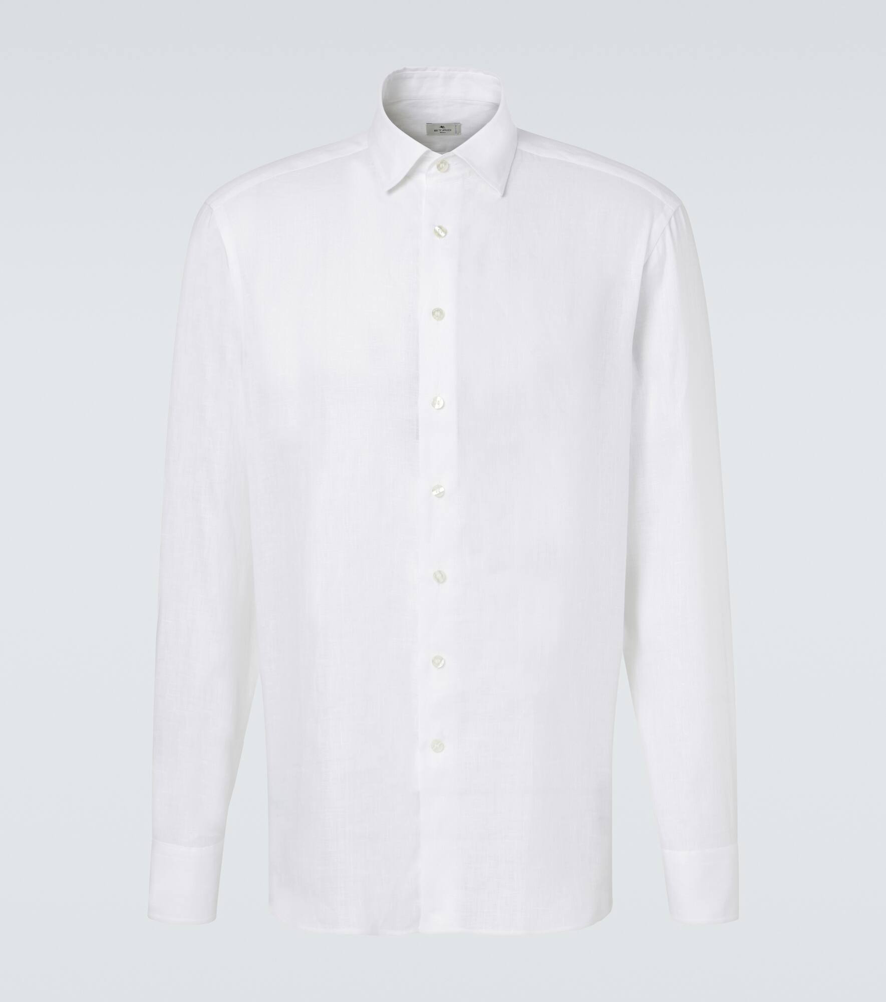 Etro translates its artisanal roots into refined pieces with a timeless edge. Crafted in Italy from pure linen, this shirt embodies minimalist refinement with its lightweight texture and relaxed silhouette. Product Details - Material: 100% linen - Care instructions: machine wash cold - Made in Italy - Designer color name: Optical White - Item color: white - Closure: buttoned placket - Hem: gusset - Cuff: two buttons - Item number: P01049729 Size & Fit - True to size - Without pleats in the back - Darts in the back - Classic fit - Non-stretchy fabric - Falls below the hip - Height of model is 189cm-74.5" and wears a size EU 41