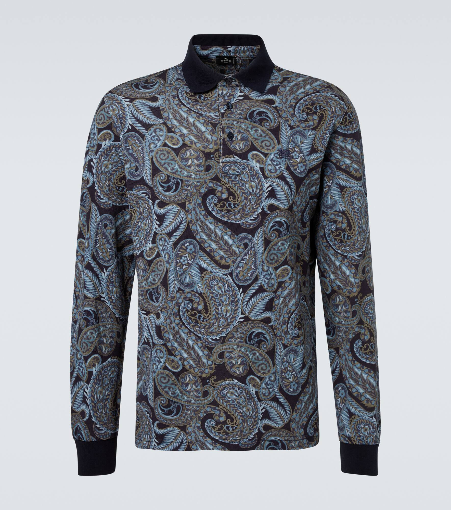 Paisley prints are so synonymous with Etro that they've become a house signature. Made in Italy, this polo sweater showcases the design atop a base of pure cotton construction. Product Details - Material: 100% cotton - Care instructions: machine wash at 30 degrees - Made in Italy - Designer color name: Print on Blue Base - Item color: blue - Collar: polo collar - Cuff: ribbed - Item number: P01049817 Size & Fit - True to size - Straight fit - Stretchy fabric - Falls to the hip - The model in the picture is 185cm-6'1" and wearing a size L