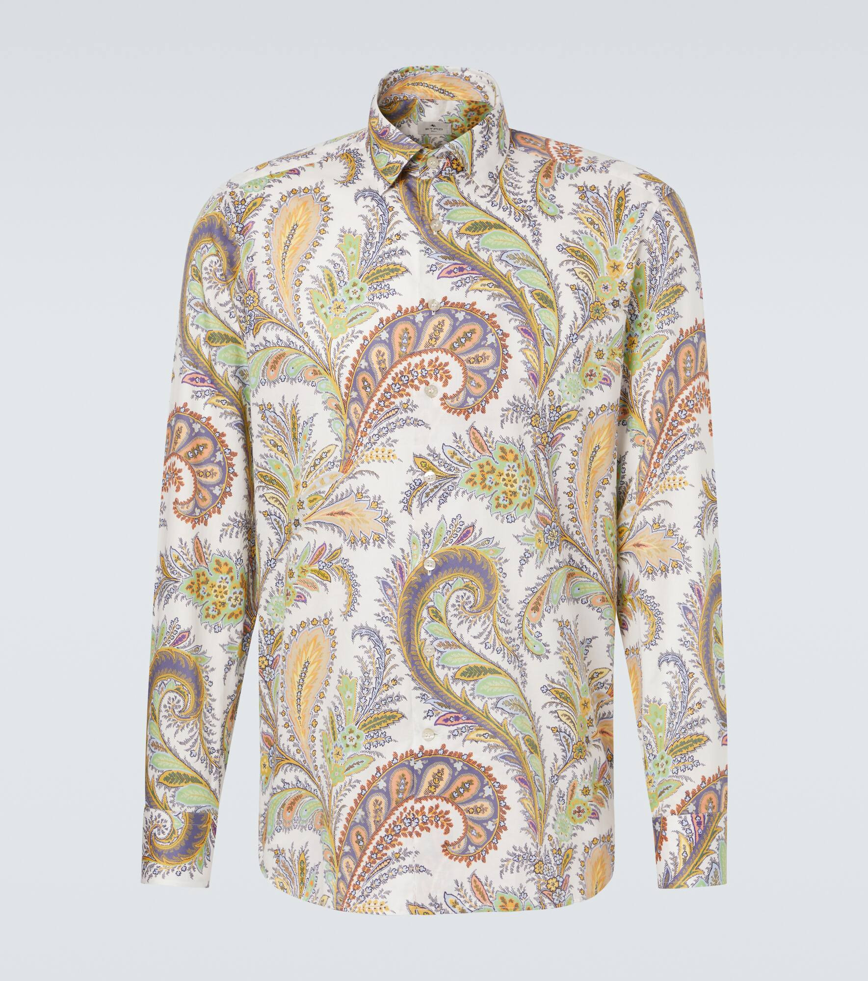 Paisley prints are so synonymous with Etro that they've become a house signature. This shirt is crafted from cotton poplin and features the brand hallmark. Product Details - Material: 100% cotton - Care instructions: dry clean - Made in Italy - Designer color name: Print On White Base - Item color: white, multicolor - Collar: classic (Straight point) - Cuff: two buttons - Closure: buttoned front - Item number: P01049730 Size & Fit - True to size - Without pleats in the back - Darts in the back - Classic fit - Non-stretchy fabric - Falls below the hip - Height of model is 188cm-74" and wears a size EU 41