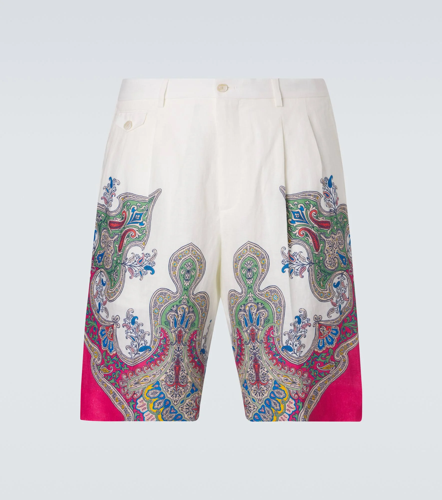 Etro has successfully kept the fashion world captivated with its free-spirited attitude and eclectic prints. These Bermuda shorts are crafted entirely from linen and boast vibrant, paisley trim. Product Details - Material: 100% linen - Care instructions: dry clean - Made in Italy - Color: white - Designer color name: Print On Red Base - Pocket lining: 100% cotton - Closure: zipper fly, button fastening - Belt loops - Pockets: slant pockets, back pockets - Item number: P01153652 Size & Fit - True to size - Non-stretchy fabric - Wide-leg - The model in the picture is 185cm-6'1" and wearing a size 50
