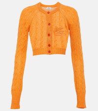 An emblem of Etro since 1968, the mythological Pegaso signifies a spirit of freedom and discovery. The motif decorates this cashmere cardigan, featuring a cable-knit construction with ribbed trims, tonal buttons, and a cropped length. Product Details - Material: 100% cashmere - Care instructions: dry clean - Made in Italy - Designer color name: Arancio - Item number: P00839518 Size & Fit - True to size - Cinched waist - Lightweight material - Cropped - The model seen in the picture is 178cm-5'10" and wearing a size IT 40
