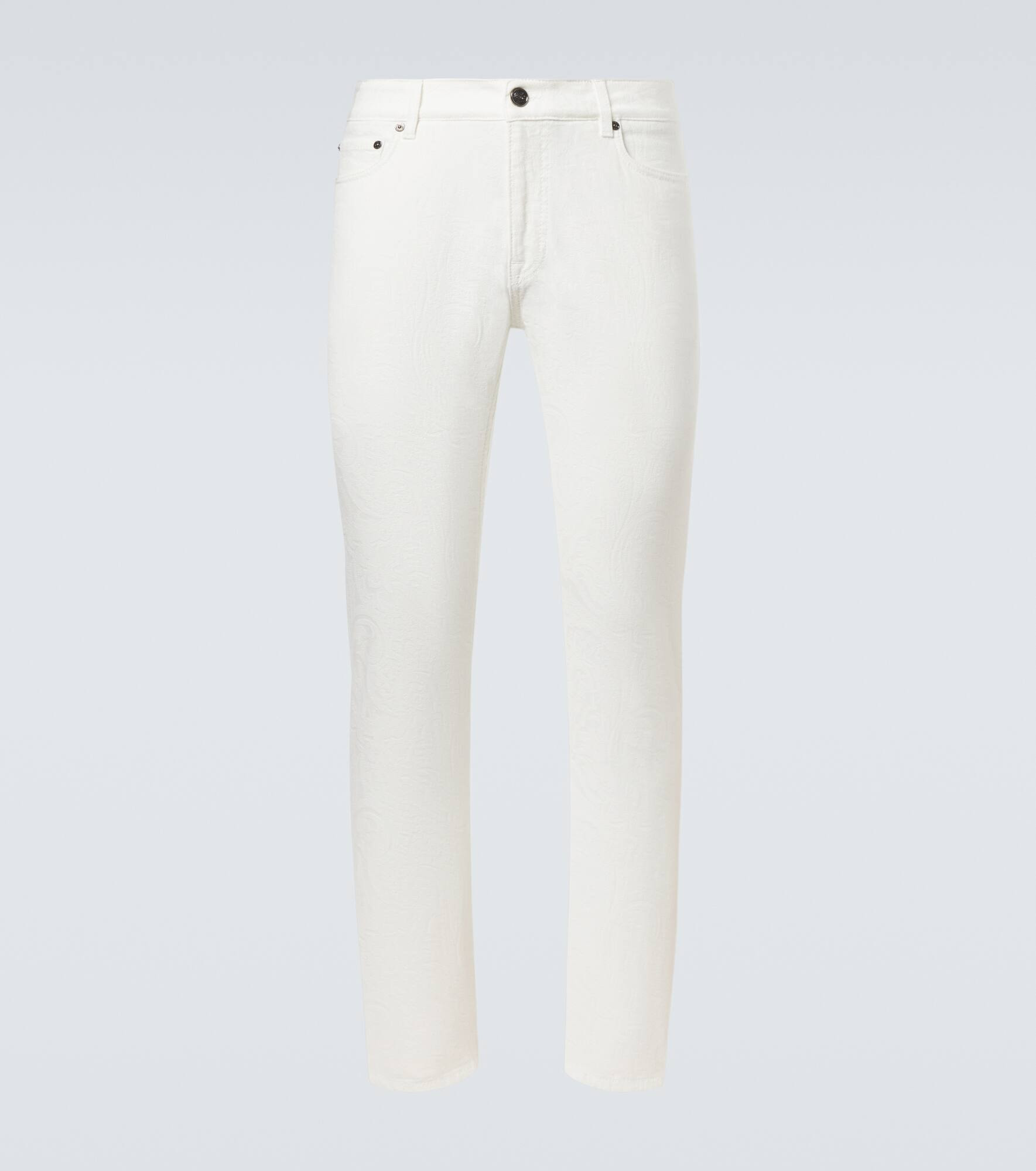 These straight jeans from Etro feature an effortlessly sophisticated silhouette with a low-rise waist. The design is complete with a Pegaso metal button, the brand's iconic emblem that signifies freedom and discovery. Product Details - Material: 98% cotton, 2% elastane - Care instructions: machine wash at 30 degrees - Made in Italy - Designer color name: Optical White - Item color: white - Pockets: five pockets - Item number: P01049756 Size & Fit - True to size - Slightly stretchy fabric - Slim-leg - Low-rise - Height of model is 189cm-74.5" and wears a size 32