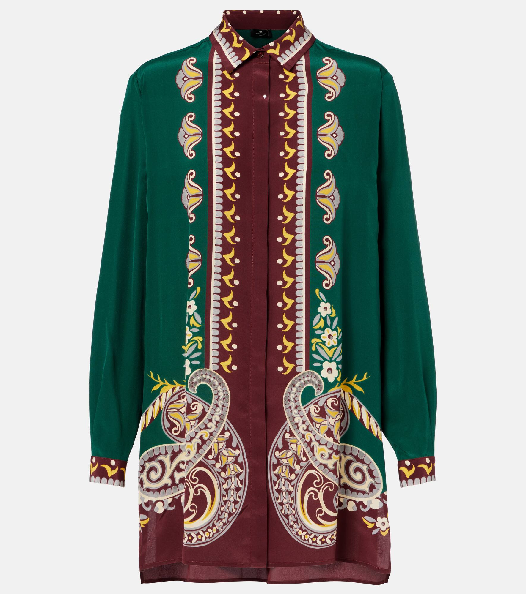This Etro oversized shirt celebrates the brand's timeless craftsmanship through its colorful print, showcasing Gerolamo and Roberta Etro's love for antique patterns. Crafted from pure silk, the piece features a classic collar and a concealed button fastening. Product Details - Material: 100% silk - Care instructions: dry clean - Made in Italy - Designer color name: Green - Item color: green, multicolor - Closure: concealed button placket - Collar: classic (Straight point) - Cuff: one button - Side slits - Item number: P01072959 Size & Fit - True to size - Dropped shoulders - Designed for a loose fit - Non-stretchy fabric - Falls below the hip - The model seen in the picture is 178cm-5'10" and wearing a size IT 40