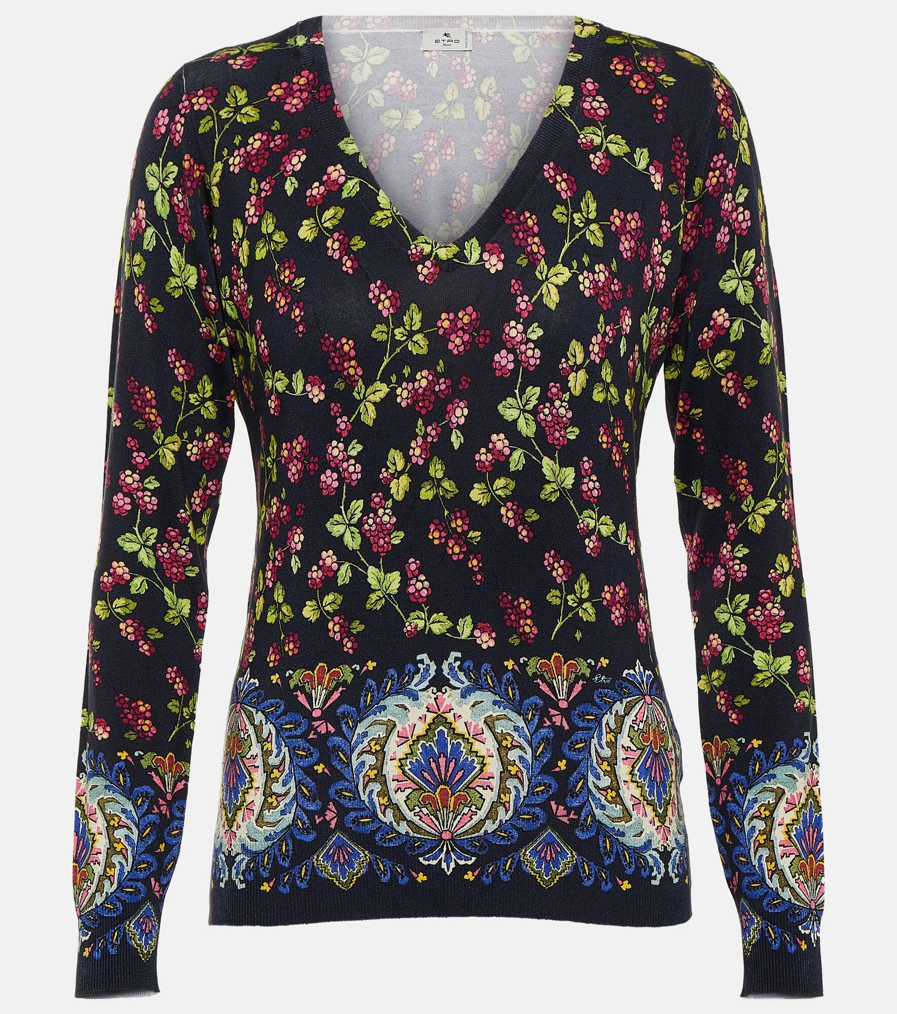 This sweater from Etro combines maximalist prints with a classic silhouette. This style is made from a soft and lightweight silk blend with an elegant V-neck. Product Details - Made in Italy - Material: 15% elastane, 85% silk - Care instructions: dry clean - Designer color name: Blue - Item number: P00837932 Size & Fit - True to size - Dropped shoulders - Straight fit - Mid-weight material - Falls to the hip - The model seen in the picture is 178cm-5'10" and wearing a size IT 40