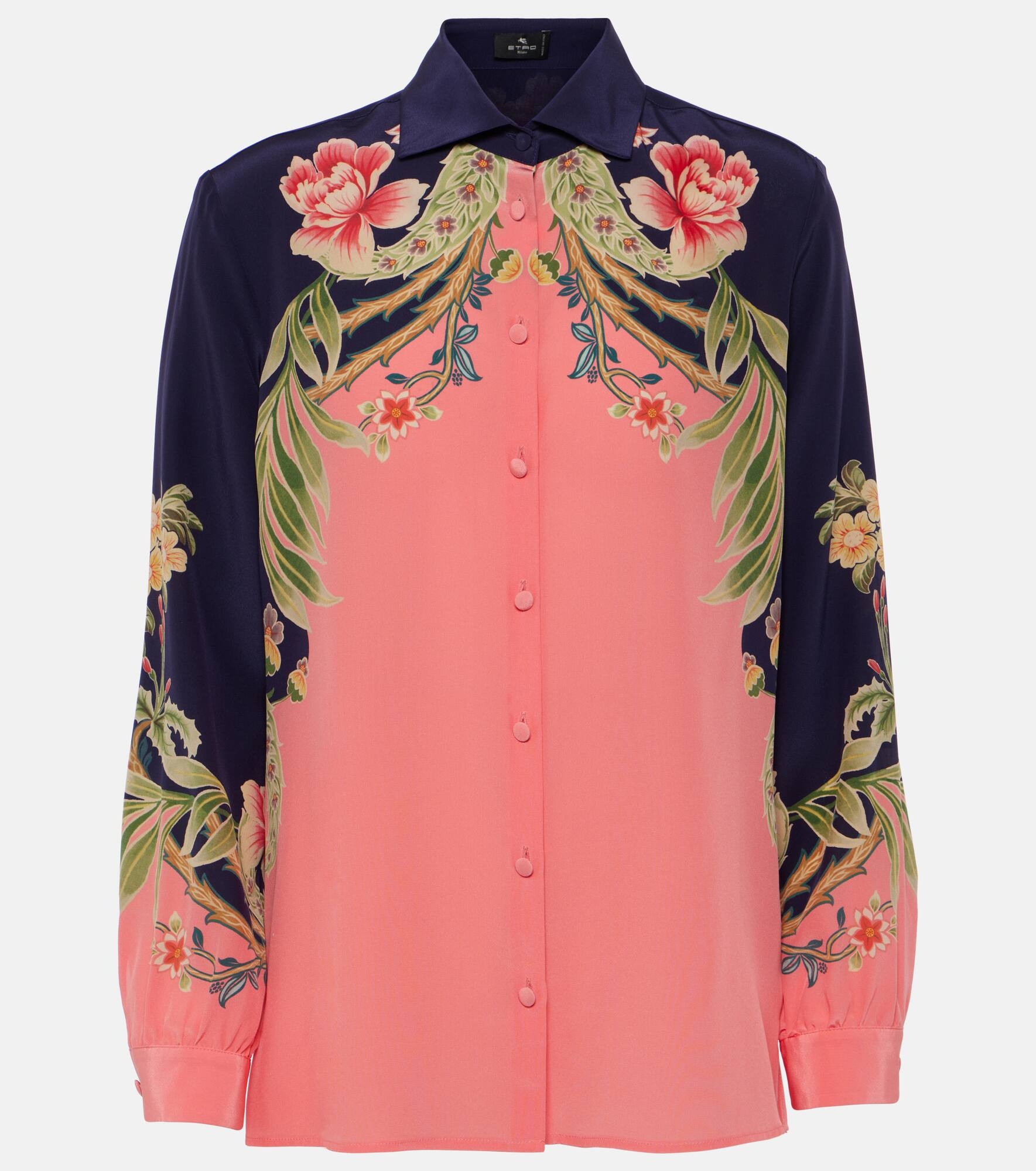 Product Details - Material: 100% silk - Care instructions: dry clean - Made in Italy - Designer color name: Print on Blue Base - Closure: buttoned front - Item number: P00951265 Size & Fit - True to size - Designed for a loose fit - Non-stretchy fabric - Falls to the hip - The model seen in the picture is 178cm-5'10" and wearing a size IT 40