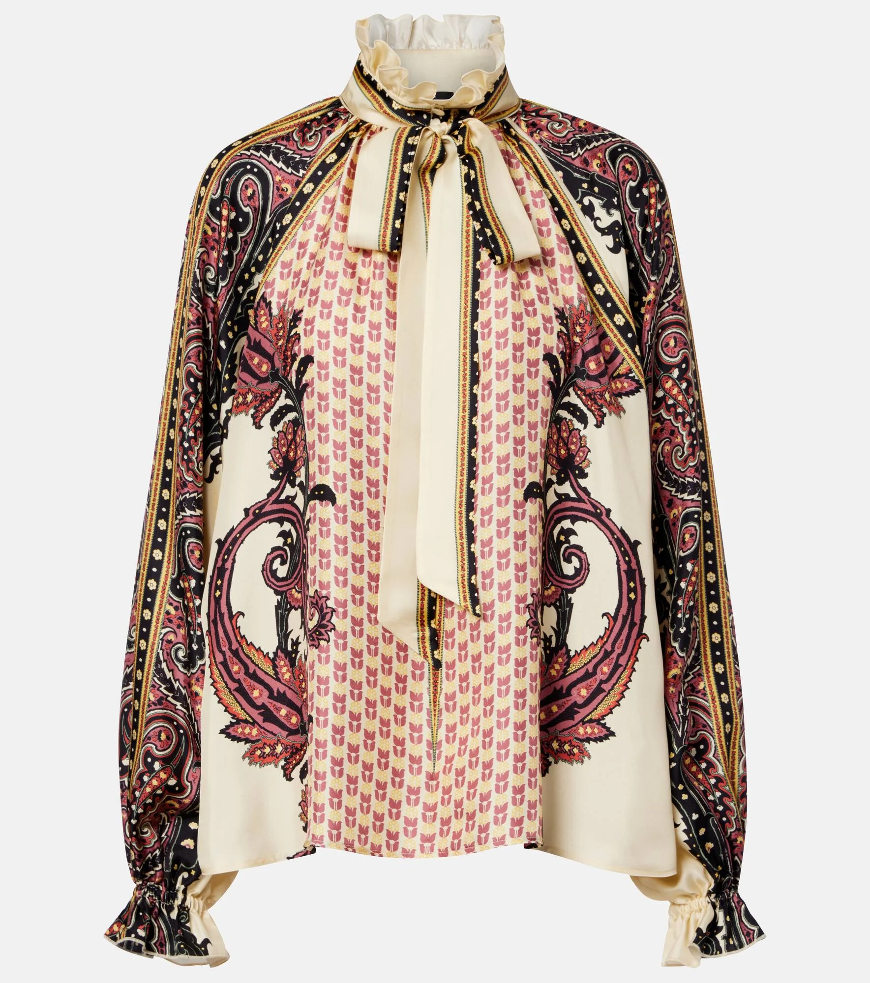 Etro's brand DNA manifests Italian glamour through revelry in color, fabric, and an approach to elegance that's entirely its own. This blouse is made from printed silk twill in Italy. Product Details - Material: 100% silk - Care instructions: dry clean - Made in Italy - Designer color name: X0805 - Item color: multicolor - Detachable band - Cuff: ruffled - Closure: buttoned front - Item number: P01122162 Size & Fit - True to size - Designed for a loose fit - Non-stretchy fabric - Falls below the hip - The model seen in the picture is 178cm-5'10" and wearing a size IT 40