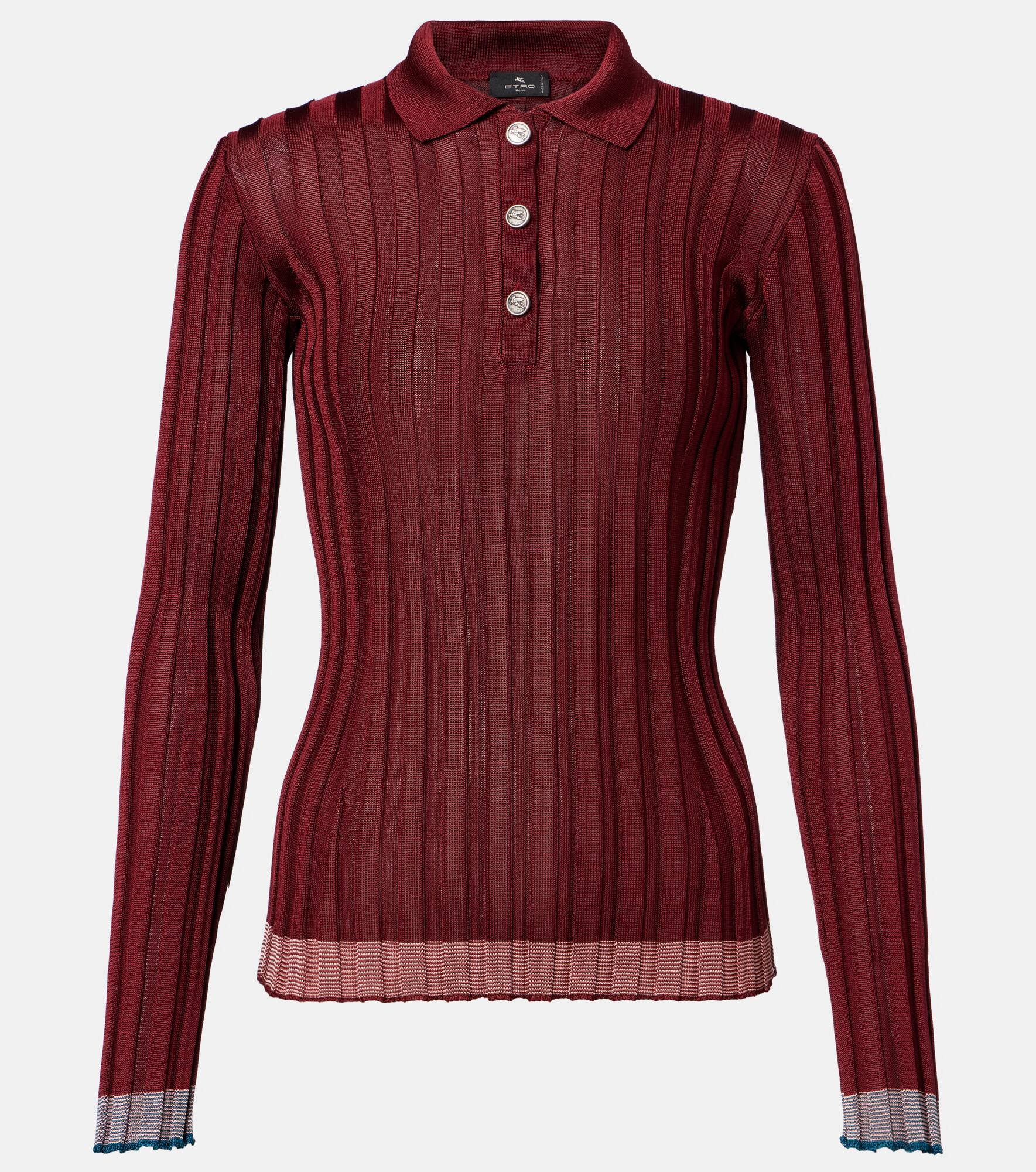 Etro balances refined designs with unexpected details and expressive prints, creating standout pieces for every occasion. This polo sweater showcases a ribbed-knit finish and the signature Pegaso buttons, representing a spirit of freedom and discovery. Product Details - Material: 100% viscose - Care instructions: dry clean - Made in Italy - Designer color name: Melanzana Scurissimo - Item color: red - Closure: partially buttoned front - Item number: P01050751 Size & Fit - True to size - Fitted - Stretchy fabric - Falls to the hip - The model seen in the picture is 178cm-5'10" and wearing a size IT 40