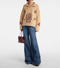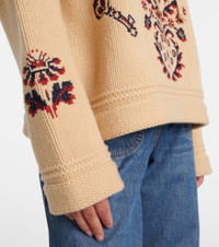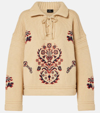 This Etro sweater brings a cozy style with its delicate pattern and relaxed silhouette. The garment is crafted in Italy from soft wool and cashmere and finished with a high neck and a self-tie front. Product Details - Material: 90% wool, 10% cashmere - Care instructions: dry clean - Made in Italy - Designer color name: Avorio - Item color: beige - Embroidery: 35% wool, 35% acrylic, 30% polyester - Closure: drawstring - Collar: turtleneck - Item number: P01050770 Size & Fit - True to size - Dropped shoulders - Designed for a loose fit - Slightly stretchy fabric - Falls to the hip - The model seen in the picture is 178cm-5'10" and wearing a size IT 40