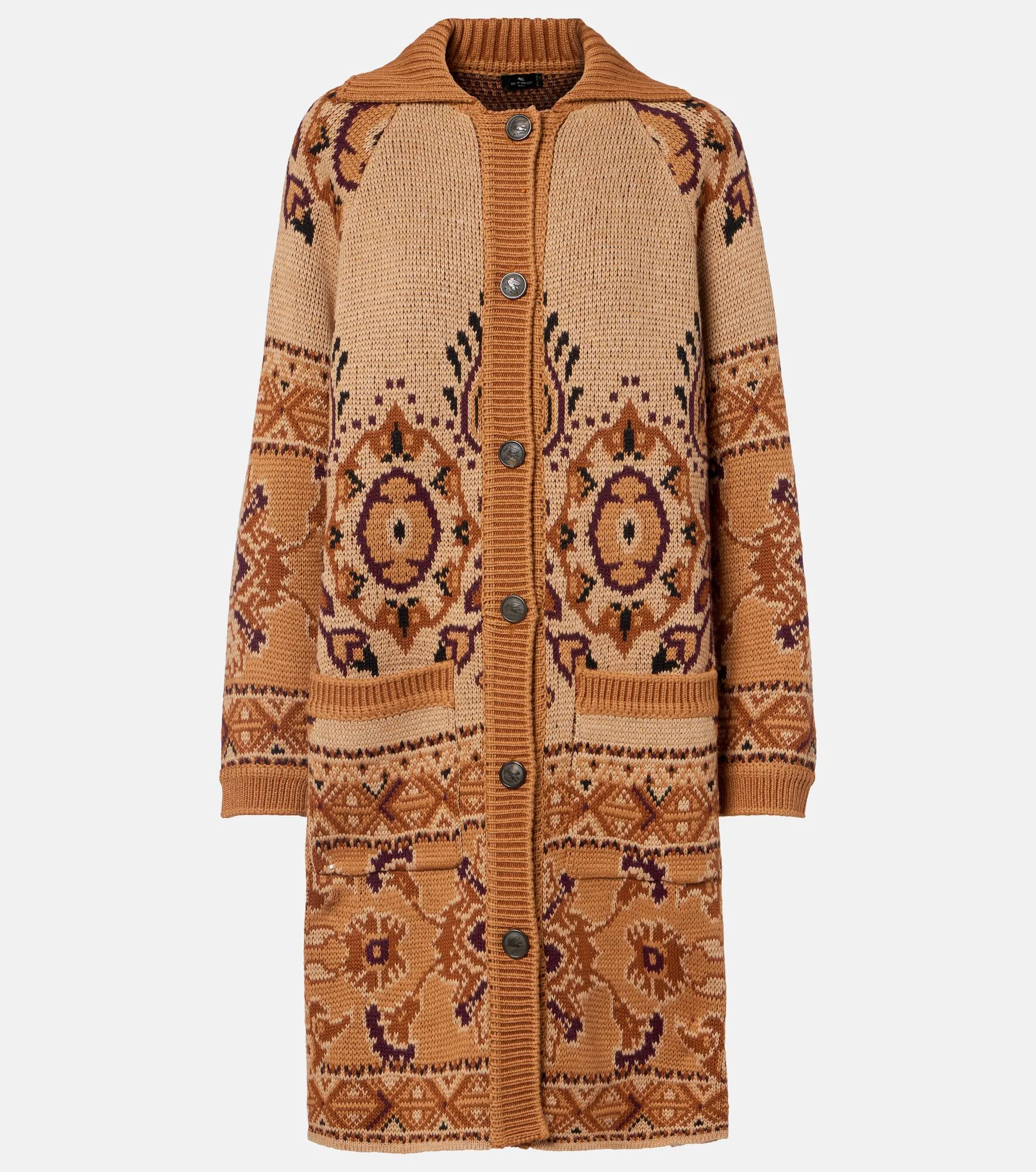 Gerolamo and Roberta Etro's love for antique prints and patterns remain a cornerstone of the Italian brand today. Knitted from a cozy wool blend, this cardigan is cut to a knee-length silhouette with a spread collar and an intricate motif. Product Details - Material: 50% wool, 50% acrylic - Care instructions: dry clean - Made in Italy - Color: brown - Designer color name: S9825 - Item color: brown - Closure: buttoned front - Pockets: patch pockets - Cuff: ribbed - Item number: P01122175 Size & Fit - True to size - Designed for a loose fit - Slightly stretchy fabric - Falls below the hip - The model seen in the picture is 178cm-5'10" and wearing a size IT 40
