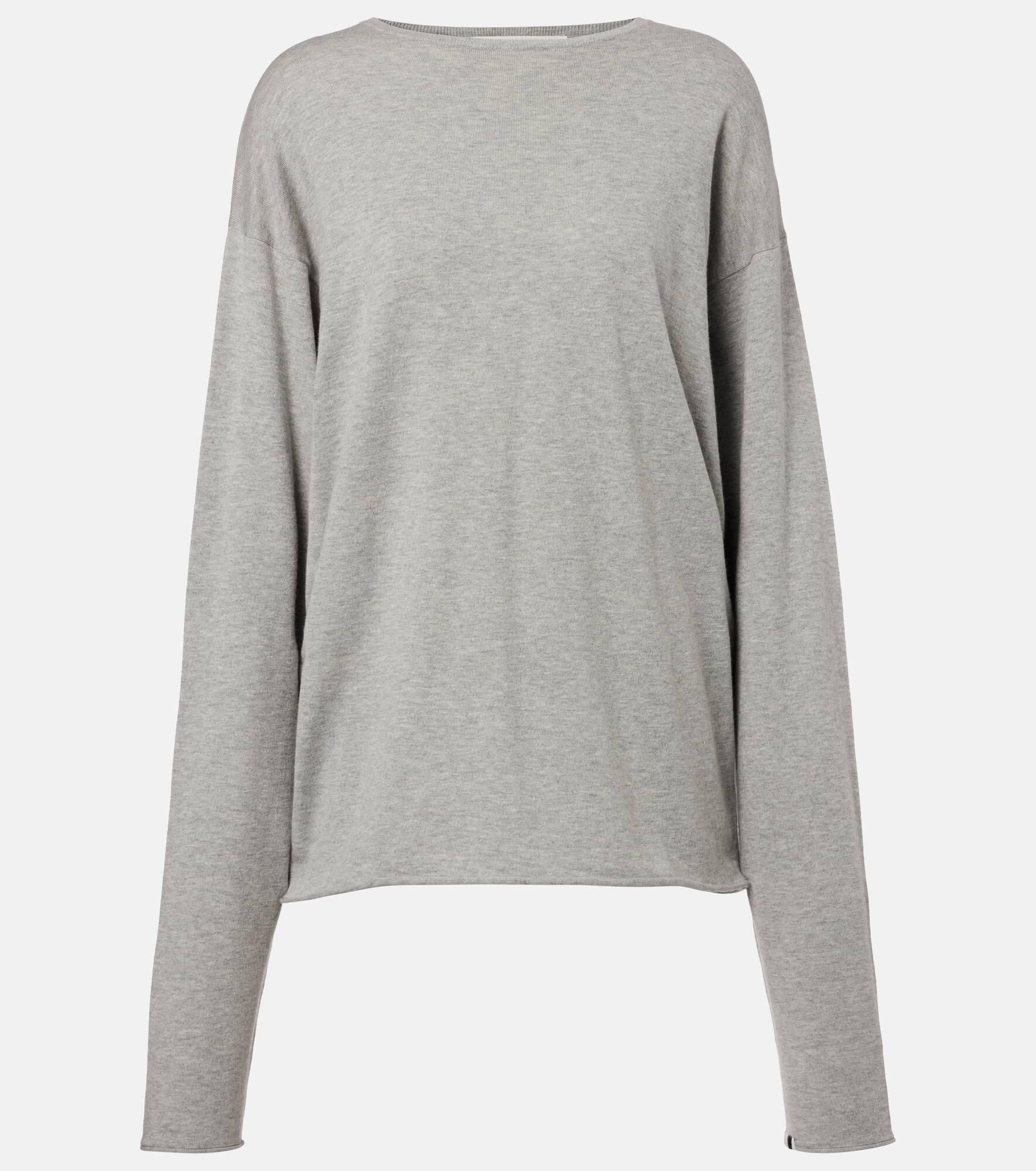 Prioritize unmatched comfort with the N°347 Aries top from Extreme Cashmere. Knitted from a lightweight blend of cotton and cashmere, this style comes in a relaxed silhouette and makes for a perfect wardrobe building block. Product Details - Material: 70% cotton, 30% cashmere - Care instructions: machine wash at 30 degrees - Made in China - Designer color name: Grey - Item color: gray - Collar: crewneck - Sleeves: dropped shoulder - Relaxed fit - Includes: dust bag - Item number: P01052423 Size & Fit - True to size - One size: perfect fit for sizes S/XL - Dropped shoulders - Designed for a loose fit - Stretchy fabric - Falls below the hip - One size