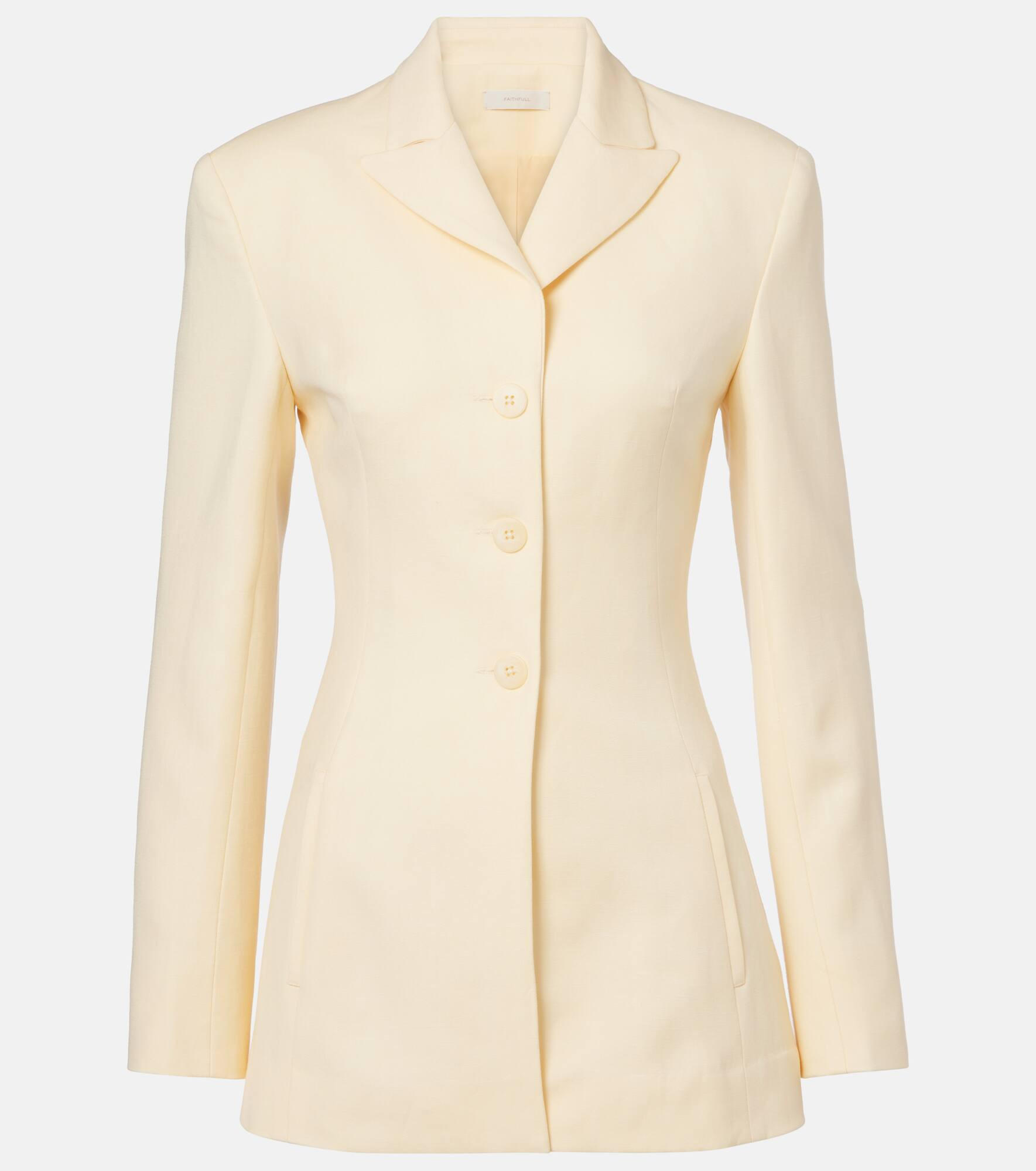 The Deni blazer from Faithfull epitomizes a summer approach to suiting. This flattering style features a single-breasted silhouette, peak lapels, and comes in a buttery yellow hue. Product Details - Material: 52.5% rayon, 26% linen, 21.5% viscose - Care instructions: dry clean - Made in China - Designer color name: Butter - Item color: ivory - Lining: 100% polyester - Blazer - Peak lapel - Cuff: four buttons - Item number: P01065186 Size & Fit - Fits small to size - we recommend trying one size larger - Shoulder pad inserts - Cinched waist - Non-stretchy fabric - Falls below the hip - The model seen in the picture is 178cm-5'10" and wearing a size S