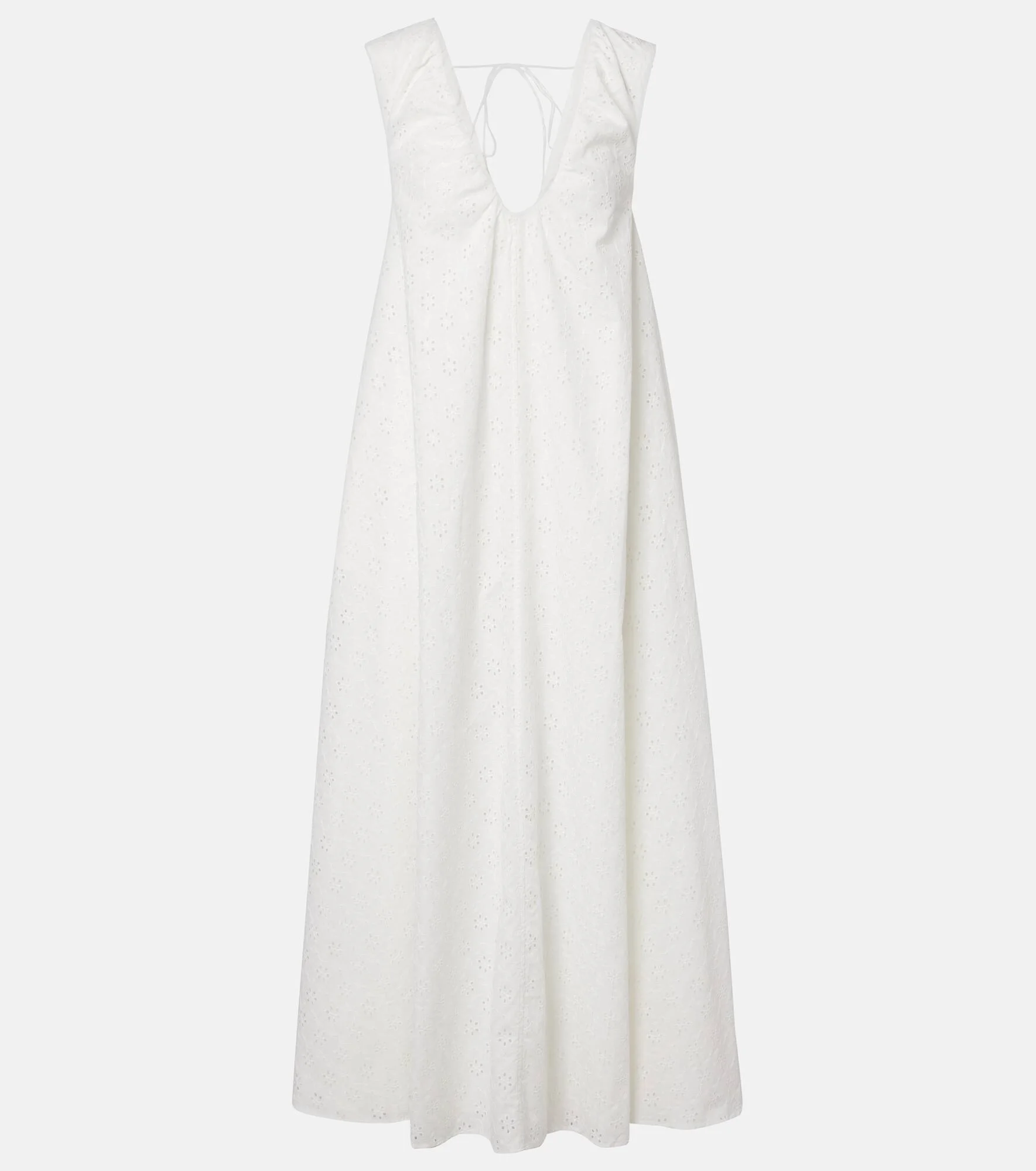True to Faithfull's ethos, this design brings the brand's passion for travel and summertime into focus. The Juana maxi dress boasts boriderie anglaise detailing and has a tie detail at the back. Product Details - Material: 65% polyester, 35% cotton - Care instructions: hand wash - Made in Indonesia - Designer color name: Valentina Broderie White - Item color: white - Lining: 100% cotton - Self-tie neck - Item number: P01130449 Size & Fit - True to size - Ideal fit for larger bust sizes - Designed for a loose fit - Non-stretchy fabric - The model seen in the picture is 178cm-5'10" and wearing a size XS