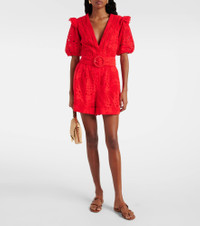 Sophisticated yet effortless, this romper from Farm Rio is your next vacation favorite. Made from breathable cotton, the vibrant style is enriched with elegant broderie anglaise detailing, a beaded belt, and ruffles at the shoulders. Product Details - Material: 100% cotton - Care instructions: hand wash - Made in China - Designer color name: Red - Item color: red - Closure: buttoned front - Item number: P01056512 Size & Fit - True to size - Loose fit, comes with belt - Non-stretchy fabric - Wide-leg - High-waisted - The model seen in the picture is 178cm-5'10" and wearing a size XS