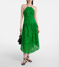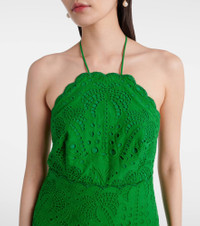Embrace warm-weather elegance with this cotton midi dress from Farm Rio. The lightweight design features a flattering cinched waist and halter neckline, complete with intricate all-over eyelet embellishments. Product Details - Material: 100% cotton - Care instructions: hand wash - Made in China - Designer color name: Green - Item color: green - Item number: P01070715 Size & Fit - True to size - Low back - Cinched waist - Non-stretchy fabric - The model seen in the picture is 178cm-5'10" and wearing a size XS