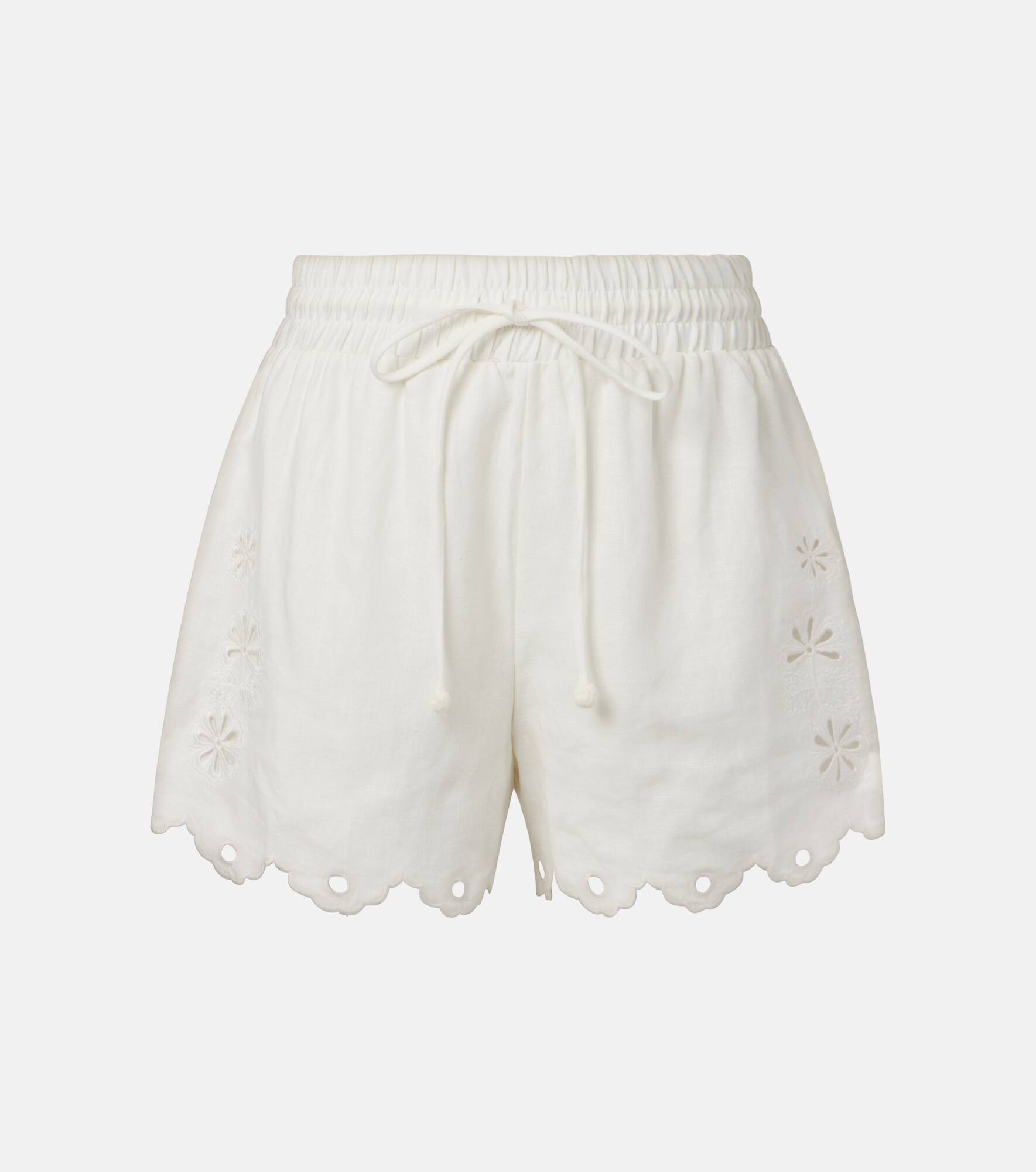 Crafted from lightweight linen, these shorts from Farm Rio feature elegant scalloped hems and floral Richelieu embroidery for a whimsical touch. The design is complete with an elasticated drawstring waistband for added comfort. Product Details - Material: 100% linen - Care instructions: machine wash cold - Made in China - Designer color name: Off-White - Item color: white - Item number: P01070717 Size & Fit - True to size - Elasticated waist - Adjustable at the waist - Non-stretchy fabric - Wide-leg - The model seen in the picture is 178cm-5'10" and wearing a size XS