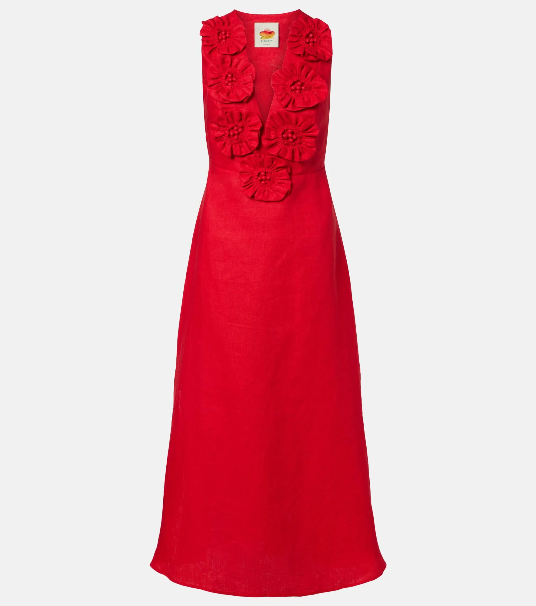 Farm Rio's signature vibrant colors celebrate the brand's Brazilian heritage and invite joyful self-expression. Made from pure linen, this midi dress is tailored to a halterneck silhouette with tonal floral appliques. Product Details - Material: 100% linen - Care instructions: hand wash - Made in China - Color: red - Designer color name: Red - Vent: double - Closure: concealed zipped side - Item number: P01150812 Size & Fit - True to size - Cinched waist - Non-stretchy fabric - slit length 48cm-19" - The model seen in the picture is 178cm-5'10" and wearing a size XS