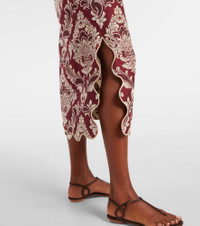 Cut from floral jacquard fabric, this Farm Rio midi skirt features a form-fitting silhouette, a side slit for movement, and a scalloped hemline. Product Details - Material: 77% polyester, 23% viscose - Care instructions: machine wash at 30 degrees - Made in Turkey - Designer color name: Blush Pink + Burgundy - Item color: burgundy, pink - Closure: zipped side - Pockets: side slit pockets - Side slits - Hem: scalloped - Item number: P01101965 Size & Fit - True to size - Non-stretchy fabric - slit length 37cm-14.5" - The model seen in the picture is 178cm-5'10" and wearing a size XS
