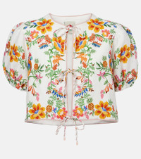 Farm Rio's vibrant motifs celebrate the brand's Brazilian heritage and invite joyful self-expression. Embroidered with a colorful floral pattern, this blouse is made from linen with puff sleeves and a self-tie front. Product Details - Material: 100% linen - Care instructions: hand wash - Made in China - Designer color name: Delicate Forest Scarves - Item color: white, multicolor - Lining: 55% linen, 45% viscose - Closure: self-ties - Elasticated cuffs - Fully lined - Item number: P01070686 Size & Fit - True to size - Straight fit - Non-stretchy fabric - Cropped - The model seen in the picture is 178cm-5'10" and wearing a size XS