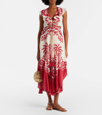 Farm Rio's signature vibrant prints celebrate the brand's Brazilian heritage and invite joyful self-expression. This Guanacaste Sand midi dress showcases a striking botanical motif, an asymmetric hemline, and flattering cutout accentuated by self-tie straps. Product Details - Material: 100% viscose - Care instructions: machine wash at 30 degrees - Made in India - Color: red - Designer color name: Guanacaste Sand - Item color: red, beige - Lining: 100% viscose - Closure: self-ties - Elasticated waistband - Item number: P01120872 Size & Fit - True to size - Cinched waist - Elasticated waist - Non-stretchy fabric - The model seen in the picture is 178cm-5'10" and wearing a size XS