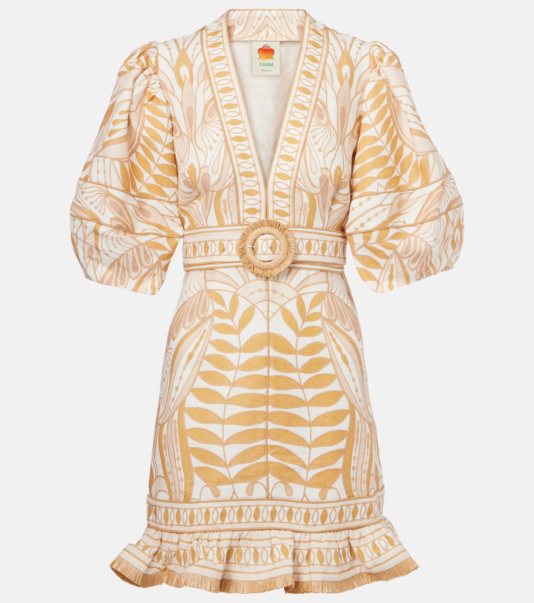 Invigorate your wardrobe with a vibrant design from Farm Rio. This minidress is crafted from airy linen and complete with a lively print and a matching belt. Product Details - Material: 100% linen - Care instructions: machine wash at 30 degrees - Made in China - Designer color name: Lace Nature Off-White - Item color: yellow, white - Lining: 100% viscose - Attached belt - Item number: P01056503 Size & Fit - True to size - Loose fit, comes with belt - Non-stretchy fabric - The model seen in the picture is 178cm-5'10" and wearing a size XS