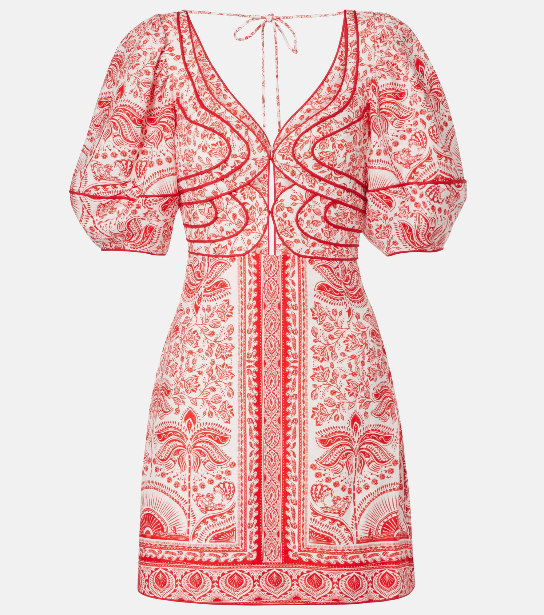 Farm Rio's signature vibrant prints celebrate the brand's Brazilian heritage and invite joyful self-expression. Crafted from a lightweight linen-blend, this minidress features a romantic all-over print, complemented by voluminous sleeves and sculptural front cutouts. Product Details - Material: 55% linen, 45% viscose - Care instructions: machine wash at 30 degrees - Made in China - Designer color name: River Ride Red - Item color: red - Self-tie neck - Closure: concealed zipper, zipped side - Item number: P01070855 Size & Fit - True to size - Low back - Cinched waist - Non-stretchy fabric - The model seen in the picture is 178cm-5'10" and wearing a size XS