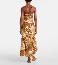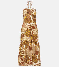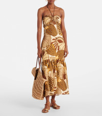 Farm Rio's signature vibrant prints celebrate the brand's Brazilian heritage and invite joyful self-expression. The Shell Mix midi dress is made from printed linen and dons a halterneck silhouette and a ruffled hem. Product Details - Material: 100% linen - Care instructions: hand wash - Made in China - Designer color name: Shell Mix Camel - Item color: multicolor - Lining: 100% viscose - Closure: zipped back - Item number: P01070780 Size & Fit - True to size - Elasticated top - Cinched waist - Non-stretchy fabric - The model seen in the picture is 178cm-5'10" and wearing a size XS