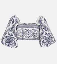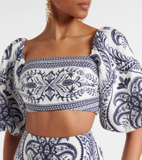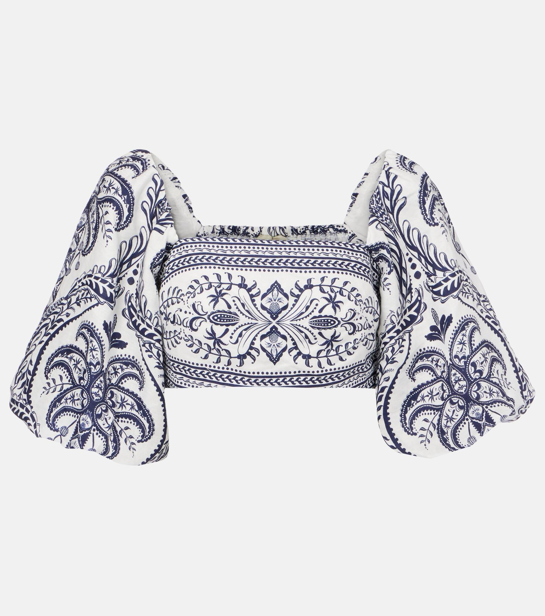 Farm Rio's signature vibrant prints celebrate the brand's Brazilian heritage and invite joyful self-expression. The Tropical Cameo printed linen blouse has a charming square neckline and playful puff sleeves. Product Details - Material: 100% linen - Care instructions: machine wash at 30 degrees - Made in China - Designer color name: Blue Tropical Cameo Off-White - Item color: multicolor - Lining: 100% viscose - Closure: invisible zipper - Item number: P01056516 Size & Fit - True to size - Elasticated top - Cinched waist - Non-stretchy fabric - Cropped - Height of model is 177cm-69.5" and wears a size XS