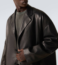 Fear of God redefines American luxury through relaxed tailoring, muted tones, and elevated everyday essentials. Made in Italy from leather, this oversized, single-breasted blazer has shoulder pads and side slit pockets. Product Details - Material: 100% leather - Care instructions: specialist clean - Made in Italy - Designer color name: Black - Item color: black - Lining: 53% cupro, 47% polybutylene terephthalate - Notched lapel - Closure: single-breasted (three buttons) - Shoulder pads - Pockets: side slit pockets - Fully lined - Item number: P01063836 Size & Fit - True to size - For a closer fit, we recommend taking one size down - Dropped shoulders - Oversized - Non-stretchy fabric - Falls below the hip - Height of model is 192cm-75.5" and wears a size L