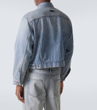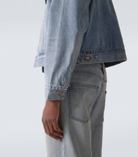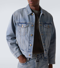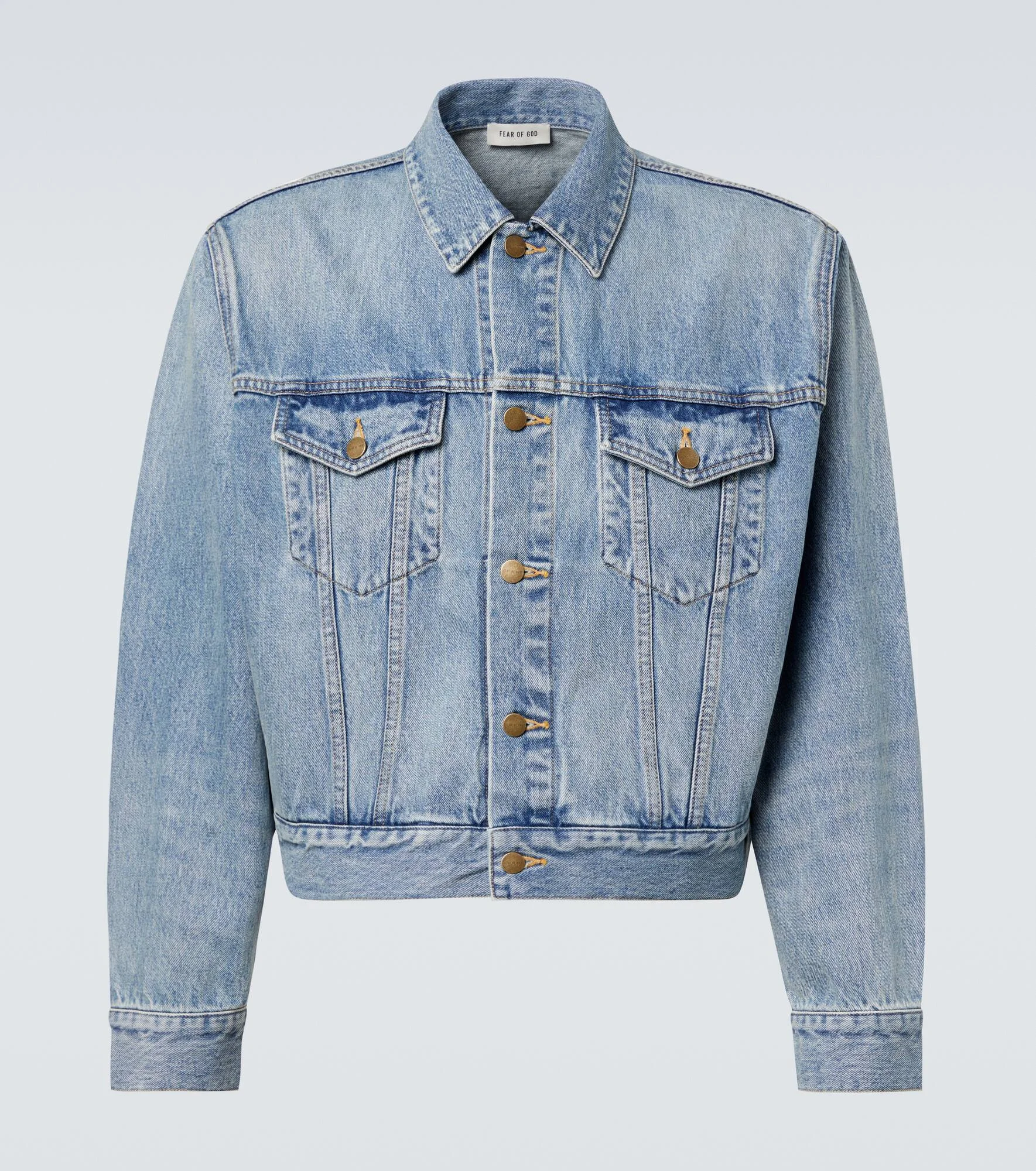 Fear of God redefines American luxury through relaxed tailoring, muted tones, and elevated everyday essentials. Cropped in silhouette, the Trucker jacket is crafted from denim in a light indigo wash. Product Details - Material: 100% cotton - Care instructions: hand wash - Made in Japan - Designer color name: Light Indigo - Item color: blue - Pocket lining: 100% cotton - Details: 100% cotton - Hardware color: gold - Collar: classic (Straight point) - Cuff: buttoned - Pockets: flap chest pockets, side slit pockets - Closure: buttoned front - Adjustable tabs at the waist - Item number: P01063822