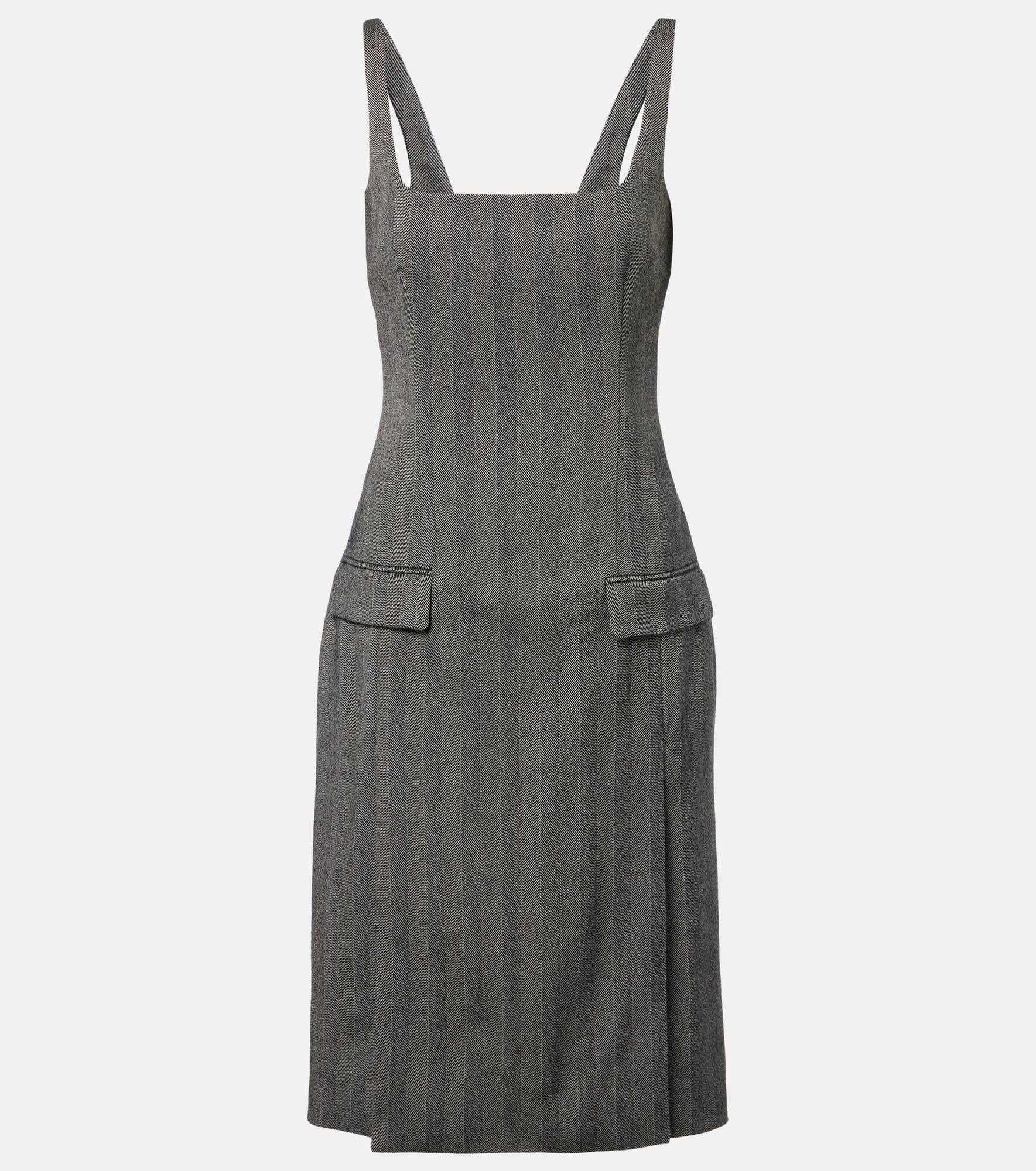 Ferragamo's elite reputation rests upon unparalleled Italian craftsmanship and a legacy of elegance. This midi dress is crafted from a soft wool blend and features a chevron motif and a front slit. Product Details - Material: 92% wool, 6% polyamide, 2% elastane - Care instructions: dry clean - Made in Italy - Designer color name: Nero/White Sand - Item color: gray - Lining: 100% viscose - Closure: concealed zipped back - Pockets: flap pockets - Long vent - Item number: P01087903 Size & Fit - Fits large to size - we recommend trying one size smaller - Low back - Fitted - Non-stretchy fabric - The model seen in the picture is 178cm-5'10" and wearing a size IT 38